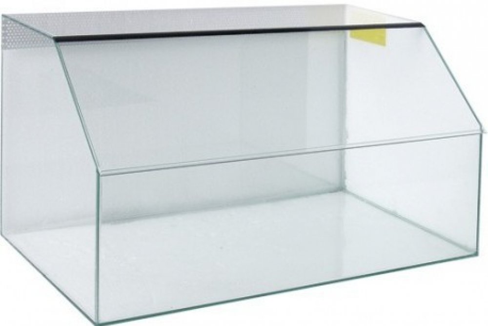 Skleněné terárium s šikmou čelní stěnou a větráním (v zádech). Ideální příbytek pro plazy a obojživelníky.