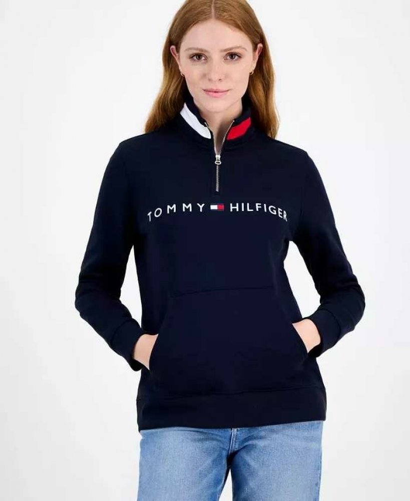 Elegantní stojáček a nastavitelný čtvrt zip se skvěle doplňují s ikonickým vyšívaným logem, díky čemuž je tato mikina Tommy Hilfiger sportovní nezbytností.