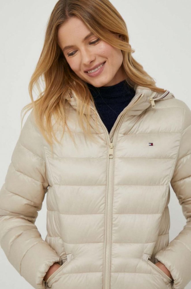 Dámská béžová prošívaná bunda od Tommy Hilfiger.Bunda má kapuci schovanou v límci se zipem.Bunda má dvě boční kapsy se zapínáním na zip.Materiál:vnější vrstva: 100% polyesterVýplň:100% polyester. Střih: regular fit
