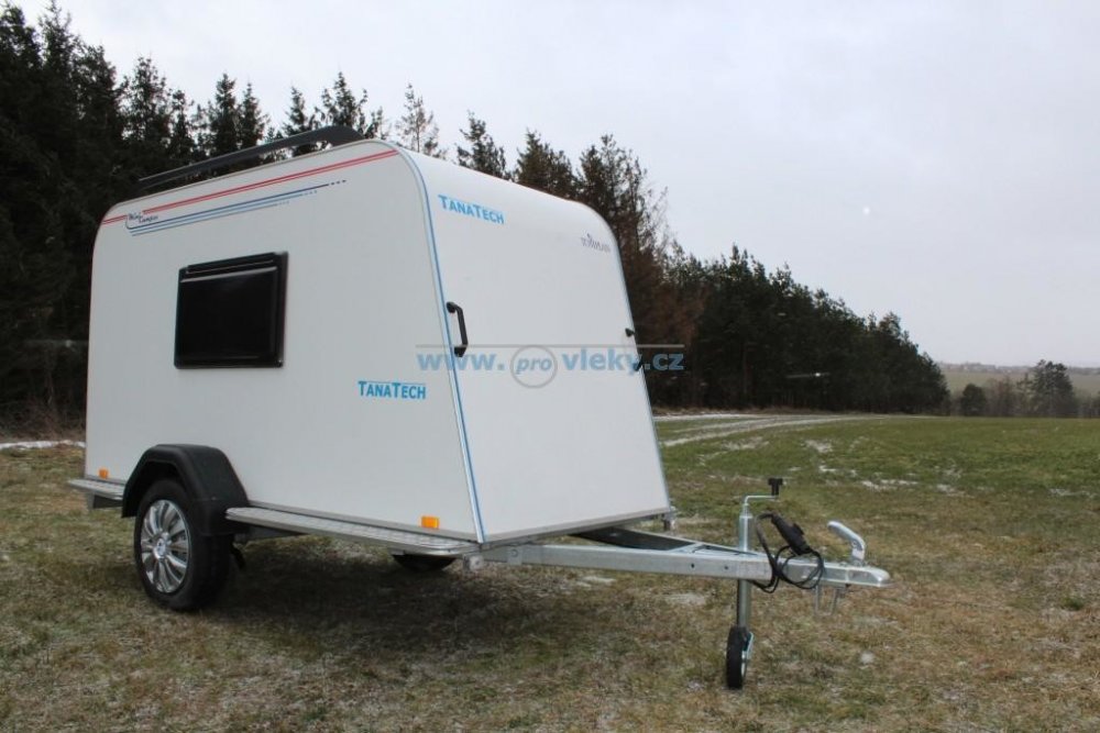 Stylový obyvatelný přívěs - základ pro minikarvan. Vhledem k šířce vhodný pro dvě osoby.