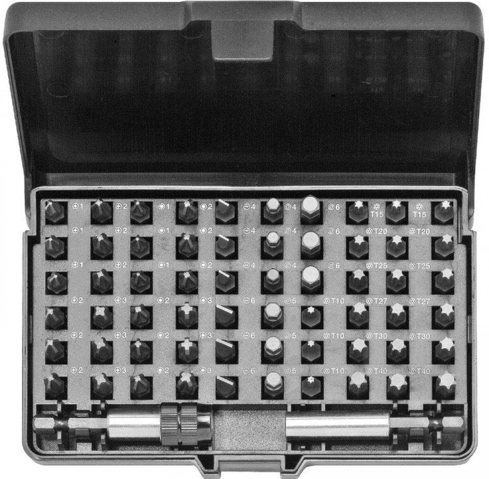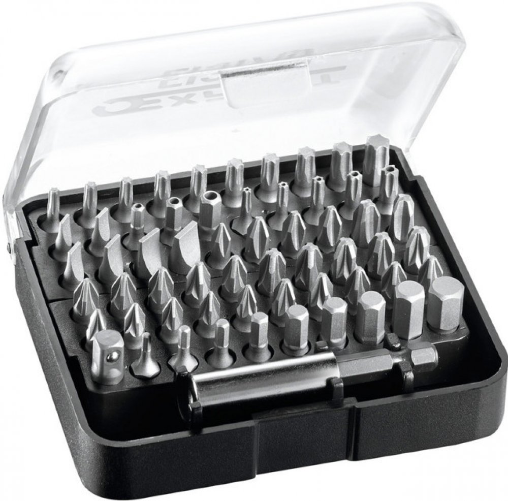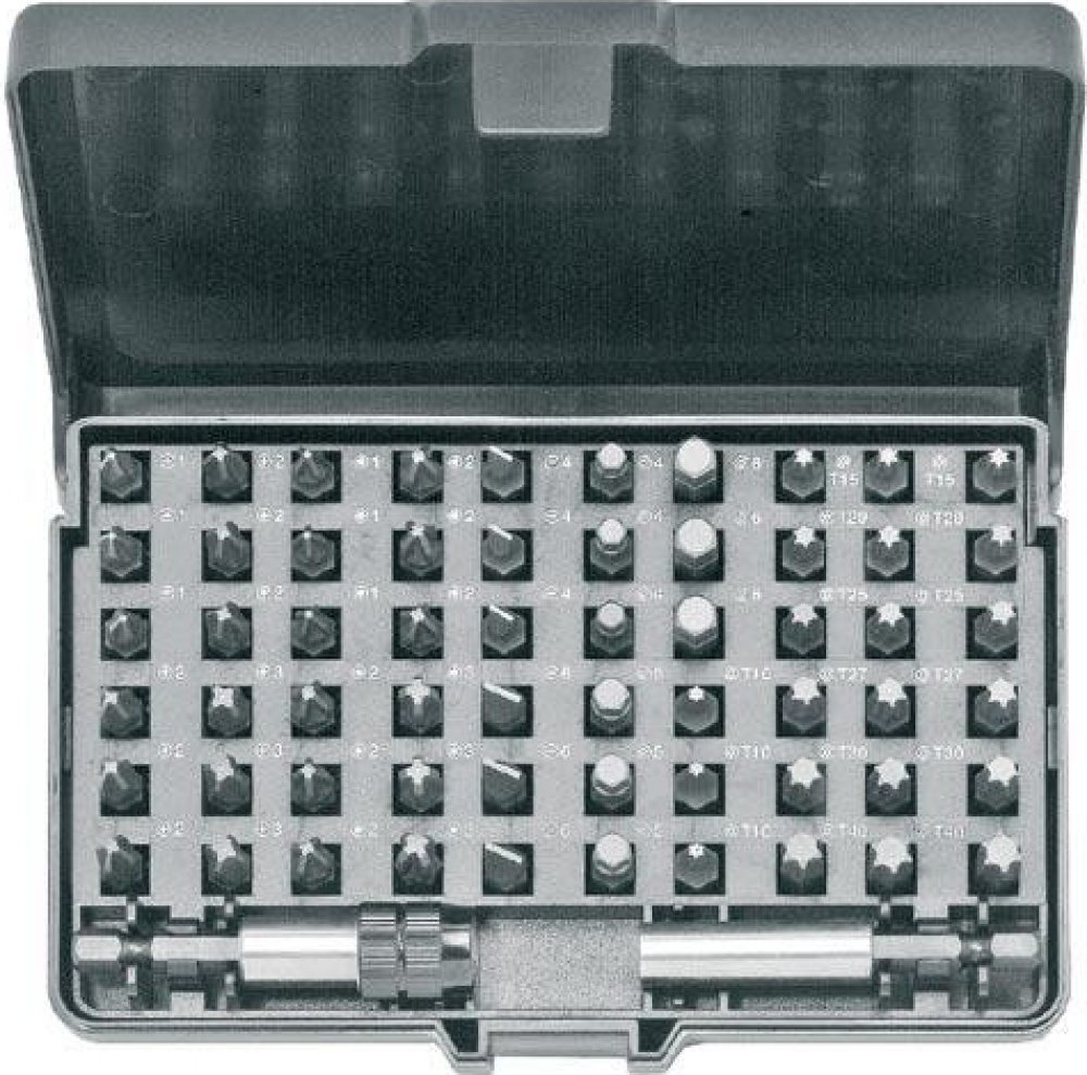 Praktická sada nejpoužívanějších bitů ve velikosti 1/4" v plastovém boxíku. Krom bitů sada obsahuje také magnetický adaptér a adaptér na bity s aretací – zámkem.