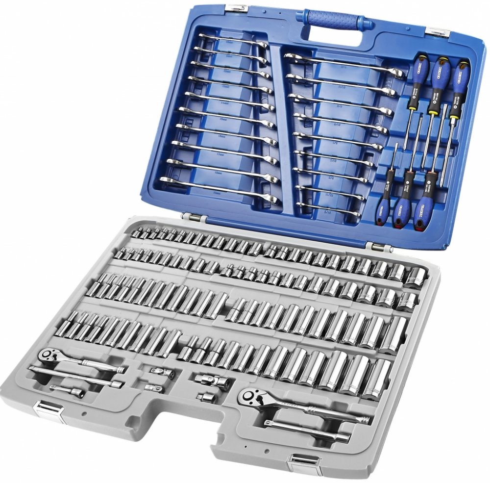 - 13x 1/4" 6hranné metrické hlavice: 4 - 4,5 - 5 - 5,5 - 6 - 7 - 8 - 9 - 10 - 11 - 12 - 13 - 14 mm menší než BR> - 12x 1/4" 6hranné prodloužené metrické hlavice: 4 - 5 - 5,5 - 6 - 7 - 8 - 9 - 10 - 11 - 12 - 13 - 14 mm menší než BR> - 10x 1/4" 6hranné palcové hlavice: 3/16 - 7/32 - 1/4 - 9/32 - 5/16 - 11/32 - 3/8 - 7/16 - 1/2 - 9/16" menší než BR> - 10x 1/4" 6hranné prodloužené palcové hlavice: 3/16 - 7/32 - 1/4 - 9/32 - 5/16 - 11/32 - 3/8 - 7/16 - 1/2 - 9/16" menší než BR> - 10x 3/8" 6hranné metrické hlavice: 10 - 11 - 12 - 13 - 14 - 15 - 16 - 17 - 18 - 19 mm menší než BR> - 10x 3/8" 6hranné prodloužené metrické hlavice: 10 - 11 - 12 - 13 - 14 - 15 - 16 - 17 - 18 - 19 mm menší než BR> - 14x 3/8" 6hranné palcové hlavice: 1/4 - 5/16 - 11/32 - 3/8 - 7/16 - 1/2 - 9/16 - 5/8 - 11/16 - 3/4 - 13/16 - 7/8 - 15/16 - 1" menší než BR> - 13x 3/8" 6hranné prodloužené palcové hlavice: 1/4 - 5/16 - 3/8 - 7/16 - 1/2 - 9/16 - 5/8 - 11/16 - 3/4 - 13/16 - 7/8 - 15/16 - 1" menší než BR> - 10x očkoploché metrické klíče: 10 - 11 - 12 - 13 - 14 - 15 - 16 - 17 - 18 - 19 mm menší než BR> - 9x očkoploché palcové klíče: 5/16 - 11/32 - 3/8 - 7/16 - 1/2 - 9/16 - 5/8 - 11/16 - 3/4" menší než BR> - 2x ráčna: 1/4" a 3/8" menší než BR> - 3x prodlužovací nástavec: 1/4" 55 - 150 mm a 3/8" 125 mm menší než BR> - 2x univerzální kardan 1/4" a 3/8" menší než BR> - 1x adaptér z 1/4" na 3/8" menší než BR> - 1x redukce z 3/8" na 1/4" menší než BR> - 6x šroubovák: ploché 3,0 x 50 - 4,0 x 100 - 5,5 x 125, křížové Phillips® PH0 x 75 - PH1 x 100 - PH2 x 125 menší než BR>