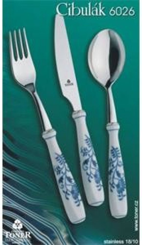 Cibulák jídelní příbor / balení 1 + 1 + 1 + 1 ks karton -originální cibulák, porcelánová část - Český porcelán a.s Dubí , kovová část - Toner a.s. 1.jakost Souprava obsahuje: 1 x lžíce jidelní 20cm 1 x vidlička jídelní 20 cm 1 x nůž jídelní 20 cm 1 x lžička na kávu 14 cm Výrobek není vhodný do mikrovlné trouby a do myčky na nádobí. Cibulová malba je pod glazurou,.Malbu lze narušit pouze rozbitím výrobku. ( glazura je tenký sklovitý povlak na povrchu výrobků.) Výrobek je zdravotně nezávadný- viz. prohlášení o shodě http://www.originalcibulak.cz/prohlaseni-o-shode/