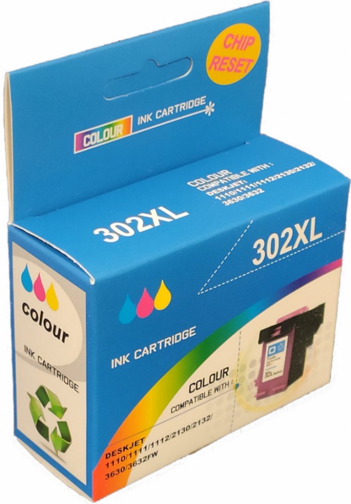 Kompatibilní barevná cartridge HP 302XL, HP F6U67AE (Azurová, Purpurová, Žlutá). Kapacita je 15ml, životnost je 400 stran A4 při 5% pokrytí.