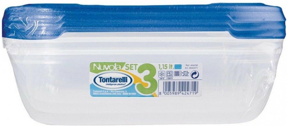 Dózy na potraviny Tontarelli Nuvola jsou nutností pro ty, kteří rádi připravují jídlo, udržují ledničku a mrazničku neustále uklizenou a chtějí mít přepravní nádoby vhodné do mikrovlnné trouby po ruce. Jsou lehké a odolné, jsou vybaveny nasazovacím víkem proti kapání a nemají těsnění, takže se obzvláště snadno čistí a dezinfikují. Tato nádoba je ideální pro uchovávání hotových jídel, zbytků a čerstvých surovin. Tontarelli: 100% Made in Italy Tontarelli je jedním z největších výrobců kuchyňských plastových předmětů v Evropě. Inteligentní doplňky zcela vyrobené v Itálii, vyznačující se jednoduchou použitelností a moderním designem.