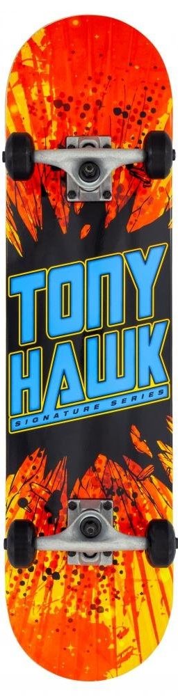 Skateboard SS 180 určený pro začínající jezdce. Menší šířka desky vhodnější pro menší jezdce osazená odolnými trucky z leštěného hliníku. Kolečka jsou osazena ložisky pro snazší učení rovnováhy během jízdy a triků. Odolná 9ti vrstvá deska nese originální design Tonyho Hawka a na vrchní straně je osazena protiskluzovým gripem.