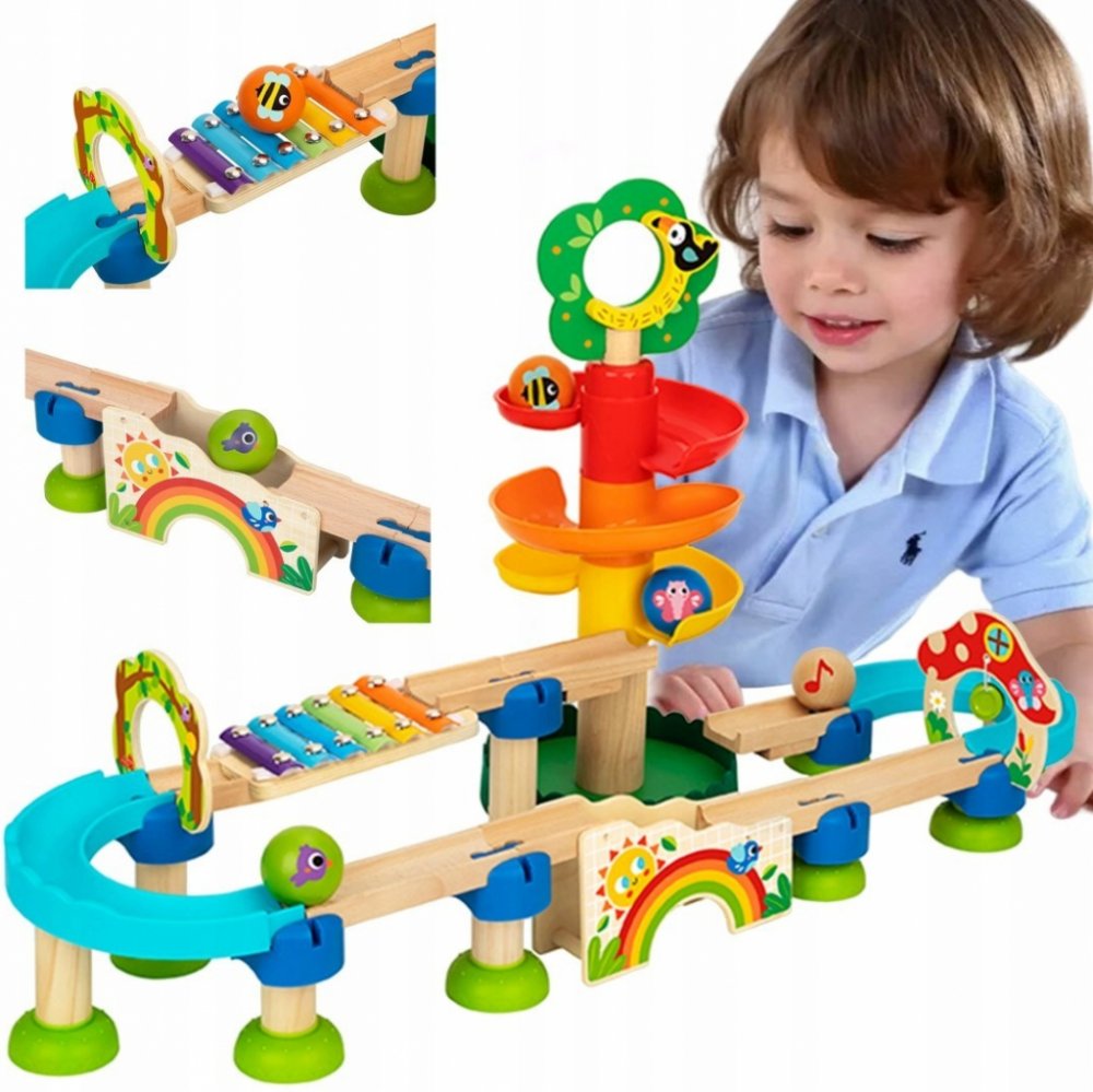 Kuličková dráha Strom Pastel 44 ks Stavebnice má také xylofon Dřevěná kuličková dráha s tobogánem v podobě stromu a funkčním xylofonem od Tooky Toy děti zcela pohltí! Stavebnice v pastelových barvách obsahuje 44 dílků a zábavných prvků, díky kterým si děti každý den postaví jinou kuličkovou dráhu. Kulička tak sjede po tobogánu v podobě stromu, zahraje na xylofon, přejde pod oblouky, přeskáče přes schůdky a dopadne do podstavce stromu. Tobogán v podobě stromu lze využít i samostatně jako kuličkovou dráhu pro nejmenší!Stavění dráhy rozvíjí představivost Děti si při hře také rozvíjí svoji kreativitu a fantazii, zlepšují si jemnou motoriku nebo se seznamují se základními principy fyziky. Kromě toho jejich stavění i pozorování kuličky neskutečně zabaví. Kuličky jsou velké a bezpečné! Dřevěné hračky pro děti Tooky Toy jsou vyrobeny z pevného kvalitního plastu a dřeva natřeného netoxickými barvami. Kuličková dráha s domínem je vhodná pro děti od 3 let.