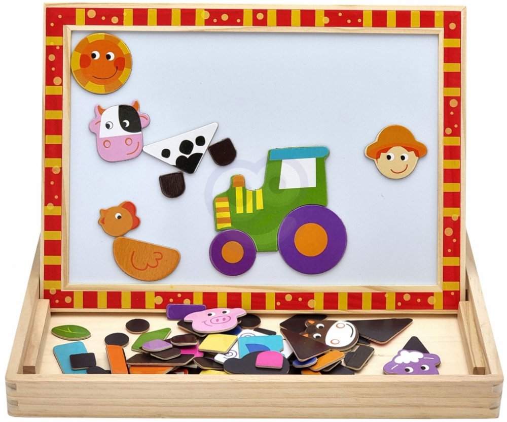 Magnetické puzzle TOOKY TOY se dvěma deskami je perfektní tip na dárek pro dítě od 3 let. Sada obsahuje dřevěnou podložku, na kterou lze umístit oboustrannou desku. Na jedné straně je křídová tabule a na druhé magnetická tabule. Tyto dvě funkce potěší každé batole. Dítě jej může používat podle vlastních preferencí a přání. Barvy a tvary bloků umožní kreativní hru. Tato tabule rozhodně podnítí fant...