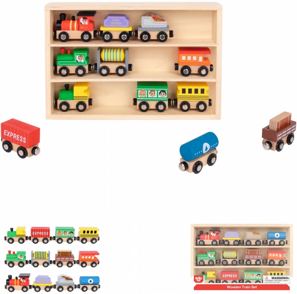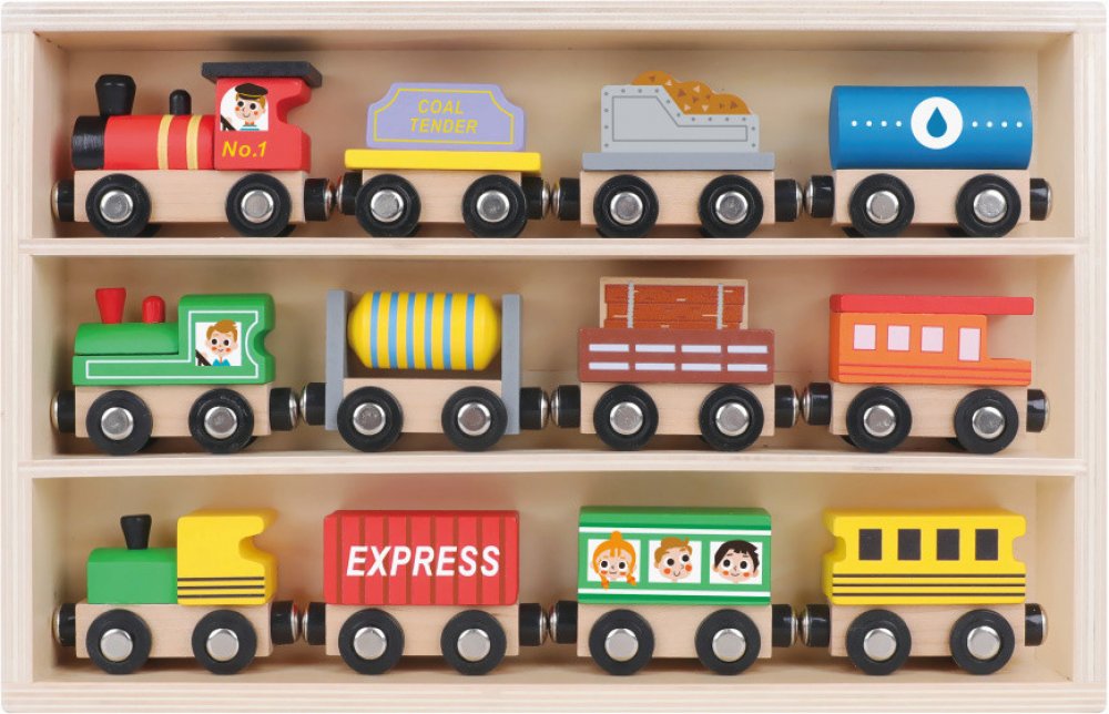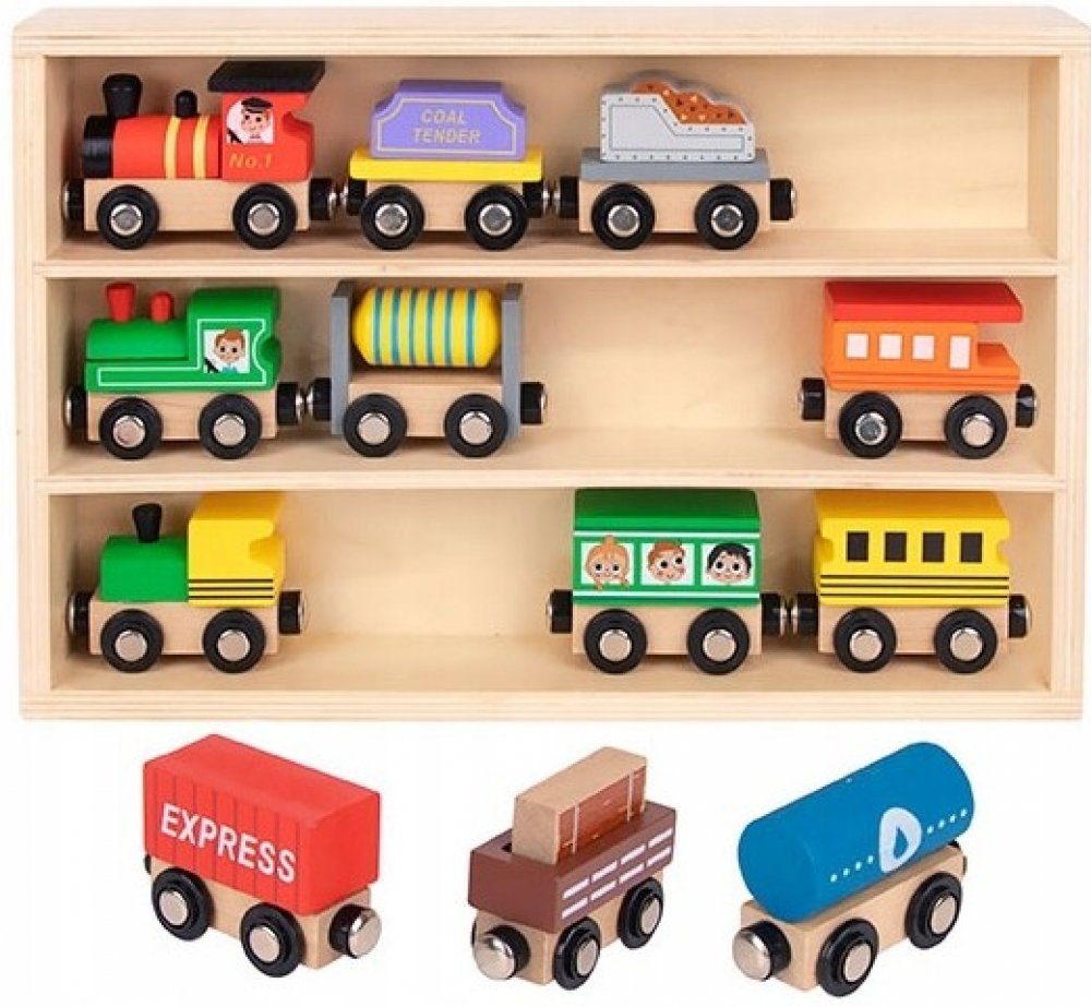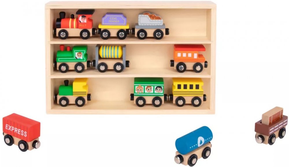 Dřevěné vláčky Set 12 ks Pastel Hurá na cestu! Sada 12 dřevěných vláčků v dřevěné vitrínce v pastelových barvách zaujme všechny nadšence vlaků, ale také milovníky autíček. Sada obsahuje 3 dřevěné mašinky a 9 různorodých osobních i dopravních vagonů. Všechny se dají krásně spojit pomocí magnetek. Dřevěná vitrínka může při hře sloužit jako nádraží či parkoviště. Po hře do ní děti zase vše uklidí.Vláčky na dřevěnou vláčkodráhu Děti si s nimi ale můžou hrát také samostatně. Zlepšují si jemnou motoriku, koordinaci ruka-oko a rozvíjejí si představivost. Při hře ve skupině si trénují své sociální a komunikační dovednosti. Vláčky Jsou vyrobené ze dřeva z udržitelného lesnictví a s ohledem na bezpečnost dětí.