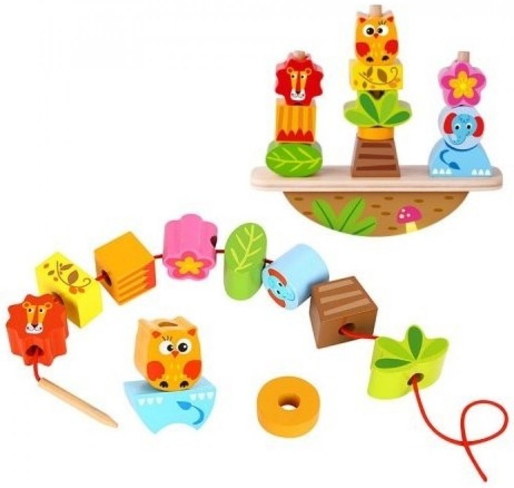 Dětičky musí nasadit kostičky s dírkami na houpací základnu tak, aby byla v rovnováze. Hra obsahuje 3 nasazovací zvířecí hlavičky a další pestrobarevné a různě tvarované korálky. Děti tak můžou na houpačce tvořit různorodé kreace. Hra je ale multifunkční a kostičky je možné navlékat i na přiložený provázek s bezpečnou dřevěnou jehlou.