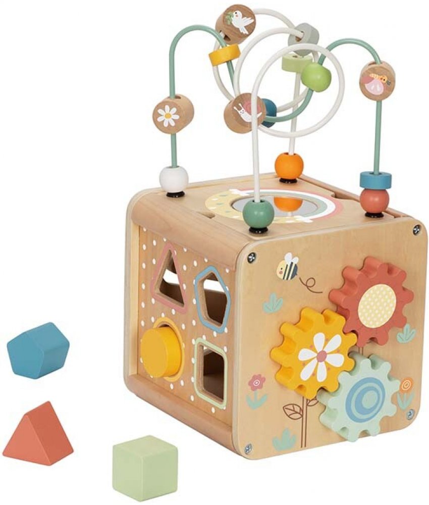 Na každé straně kostky čeká jiná aktivita: labyrint, posouvací prvky, vkládačka nebo otáčecí prvky. Horní část tvoří barevný motorický labyrint, kde si děti procvičí jemnou motoriku, soustředění a logické myšlení.