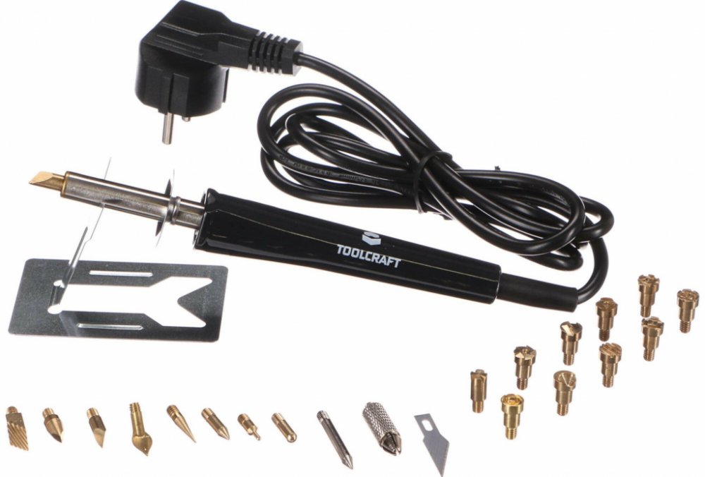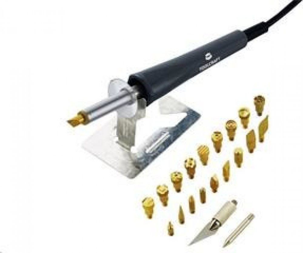 Kreativní pájecí pero Toolcraft Multi-Tool MD-30WBPP je určeno ke kreativní a trvanlivé úpravě různých materiálů. S tímto výrobkem je možné vypálit obrázky či nápisy do dřeva, kůže, vosku nebo korku. K tomuto účelu jsou k dispozici různé vypalovací hroty a raznice. Kromě toho slouží tento výrobek jako páječka pro menší pájení a jako řezačka za horka např. pro polystyren.