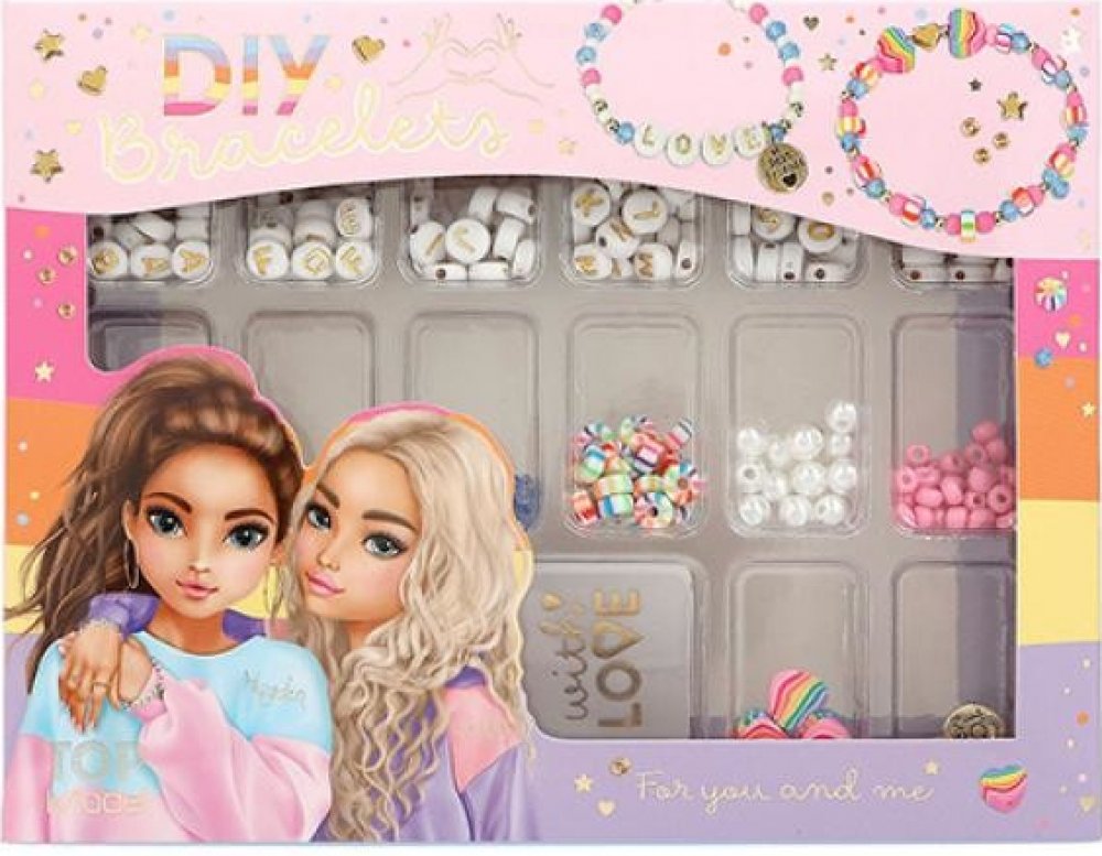 Krásná kreativní sada na výrobu náramků mimořádně oblíbené značky Top Model. Vytvoř sobě nebo tvé nejlepší kamarádce parádní náramek!Balení obsahuje spousty nejrůznějších malých barevných korálků, písmenkových korálků, zlatých přívěsků a 2 metry gumičky.Vhodné pro děti od 3 let.