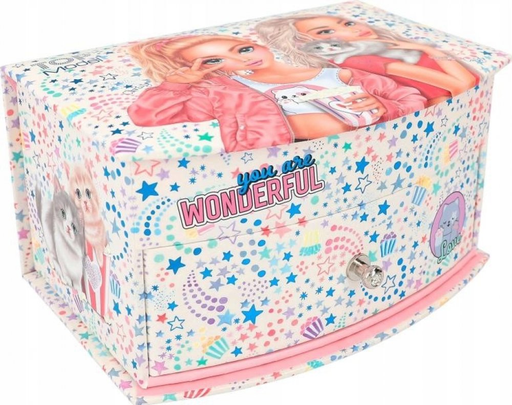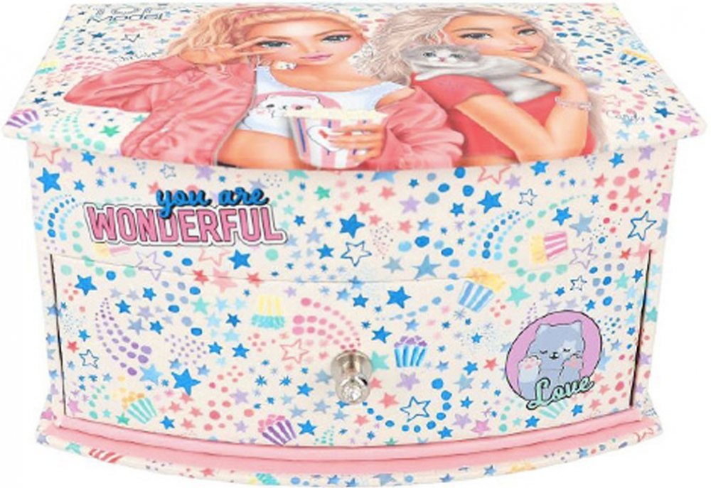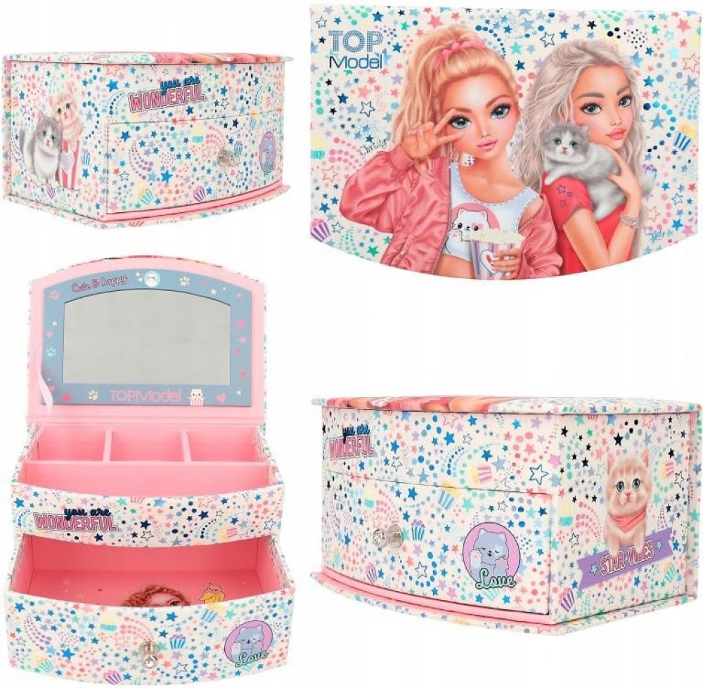 Kvalitně zpracovaná dívčí šperkovnice značky Top Model vyrobená z pevného kartonu se zrcátkem. Šperkovnice nabízí dostatečný vnitřní prostor pro přehledné uložení všech šperků! Oblíbený design nadchne všechny holčičky! Horní patro je rozděleno několika přihrádkami pro uložení menších šperků a prstýnků. Spodní vnitřní přihrádka je ideální pro větší šperky. Rozměry: 19.5 x 13.5 x 11 cm. Věk: 3+