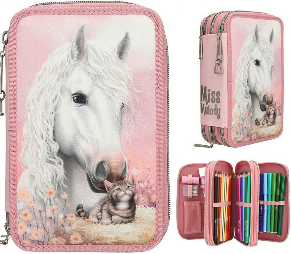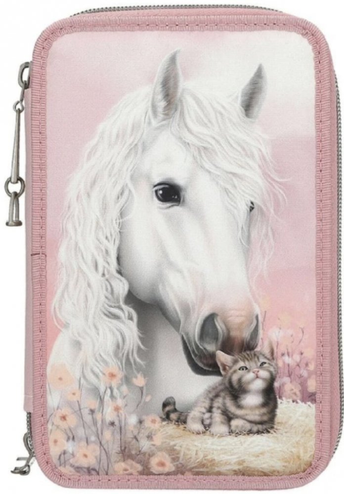 Kouzelný motiv True FriendsTřípatrový penál Miss Melody z kolekce TRUE FRIENDS potěší všechny milovnice zvířátek. Přední stranu zdobí něžný obrázek bílého koně a malého koťátka, kteří odpočívají na seníku obklopeném květinami. Jemné růžové tóny dodávají penálu kouzelný a uklidňující vzhled.