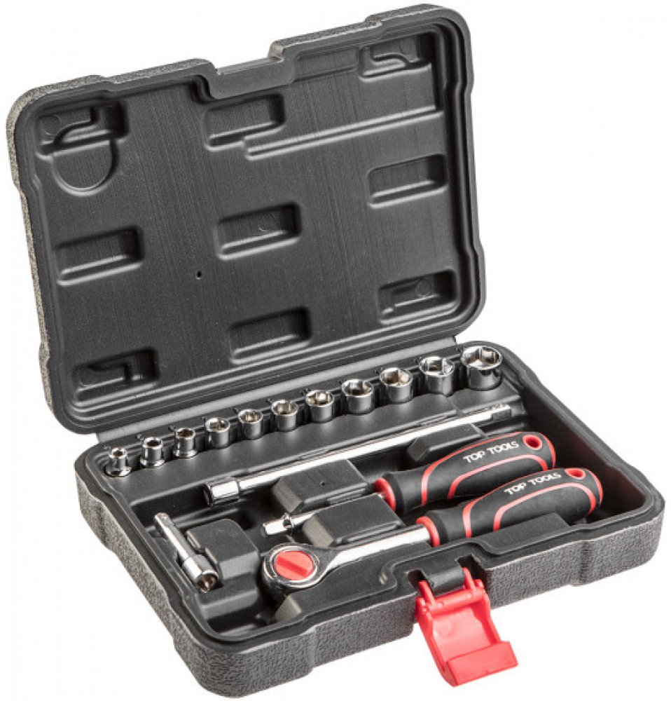 Nástrčné klíče 1/4', sada 15 ks, ráčna, 2 prodlužovací nástavce 50, 150 mm, šroubovací rukojeť pro nástrčné hlavice, 11 nástrčných hlavic o rozměrech: 4, 5, 6, 7, 8, 9, 10, 11, 12, 13, 14 mm. Sada nástrčných klíčů 1/4' (38D525) 15 ks obsahuje sadu šestihranných nástrčných hlavic 1/4' s ráčnou a rukojetí šroubováku. Vše je uloženo v praktickém plastovém kufříku.