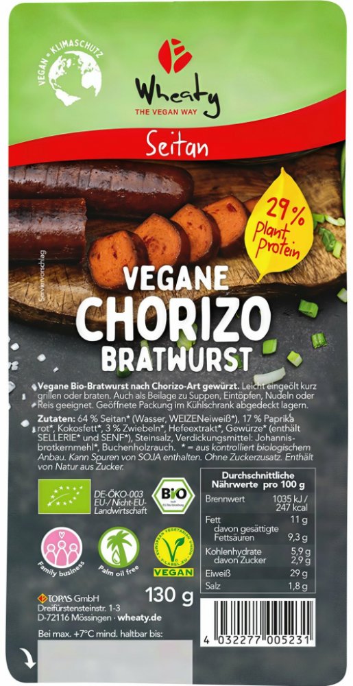 Španělská klobása CHORIZO se objevuje nově na veganské scéně: vydatná, pikantní, plná! Vydatné sousto s hrubou konzistenci! Je vhodná ke smažení na pánvi nebo na grilu, ale i na rožni, v dušených pokrmech, tortille, s rýží nebo s těstovinami.