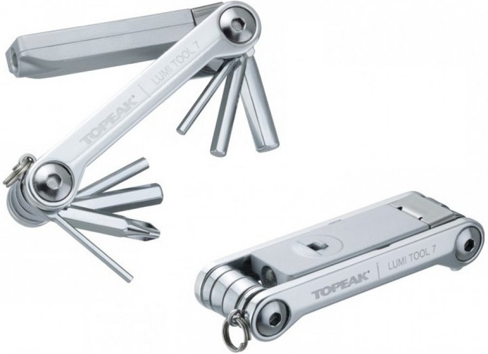 Ultra ľahký celokovový multikľúč z vysokopevnostnej kovanej duralovej zliatiny, obsahujúci 7 nástrojov v profi kvalite, vyrobených z kvalitnej chróm-vanádiovej ocele a vyberateľnú kartridž s 1 super svietivou LED diódou pre núdzové osvetlenie opravy bicykla počas tmy.