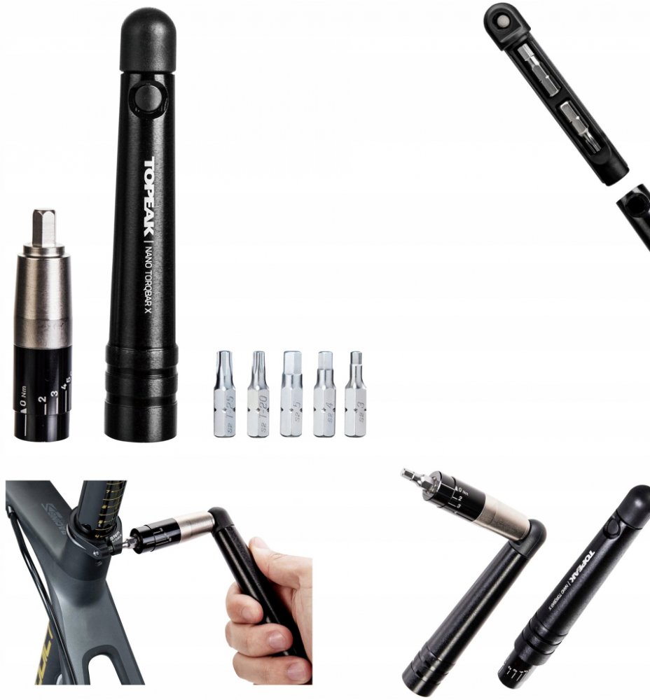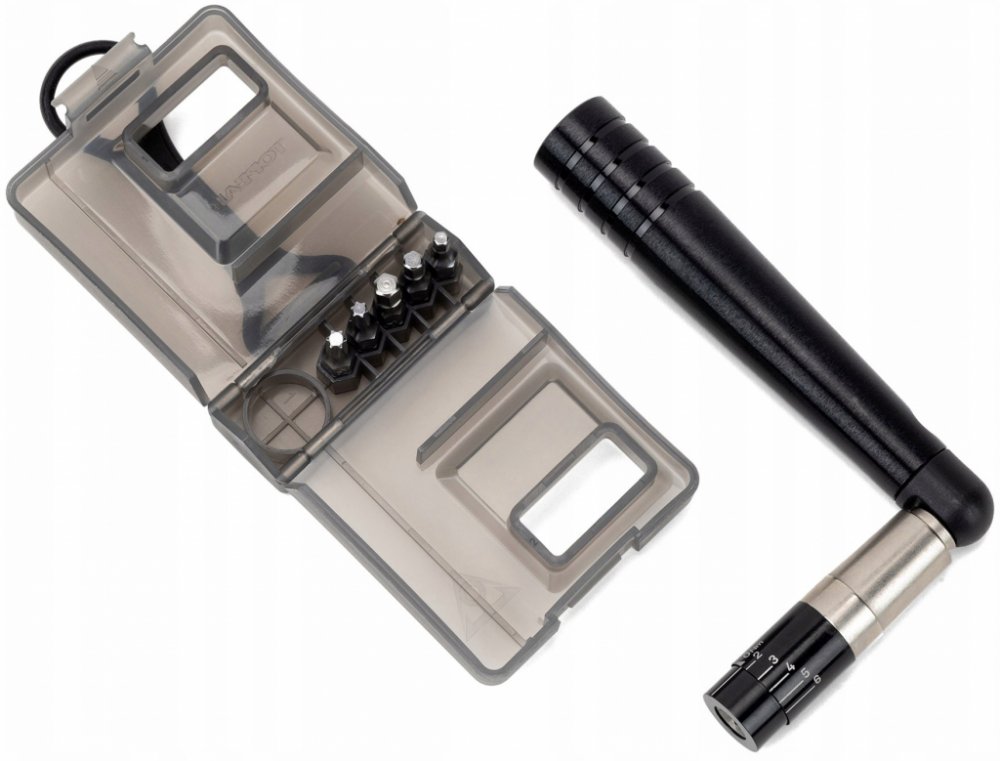 Miniaturní momentový momentový klíč s 2-6Nm nástavcem a sadou základních bitů zamezující poškození, vzniklému přetažením, například drahých karbonových částí. Dva bity mohou být umístěny přímo v těle klíče.