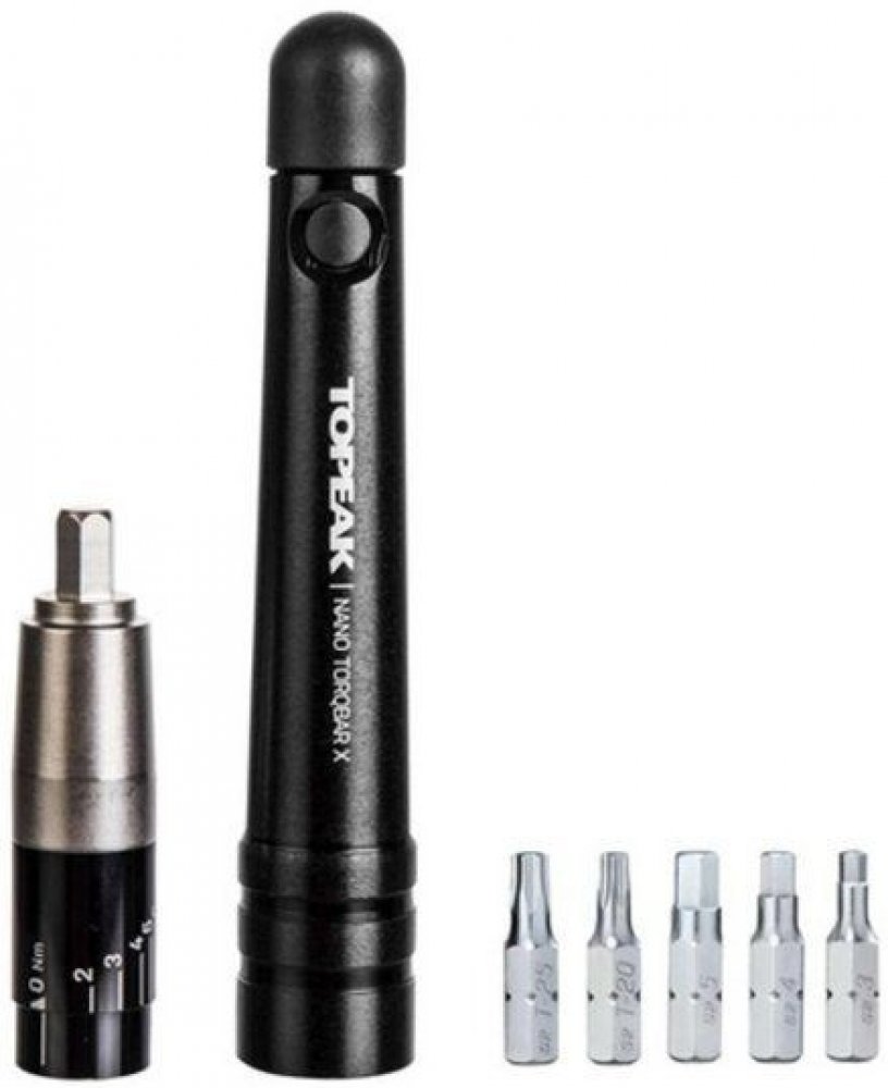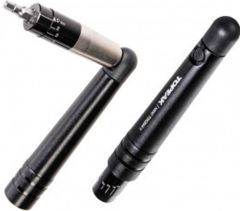 Miniaturní momentový momentový klíč s 2-6Nm nástavcem a sadou základních bitů zamezující poškození, vzniklému přetažením, například drahých karbonových částí. Dva bity mohou být umístěny přímo v těle klíče.