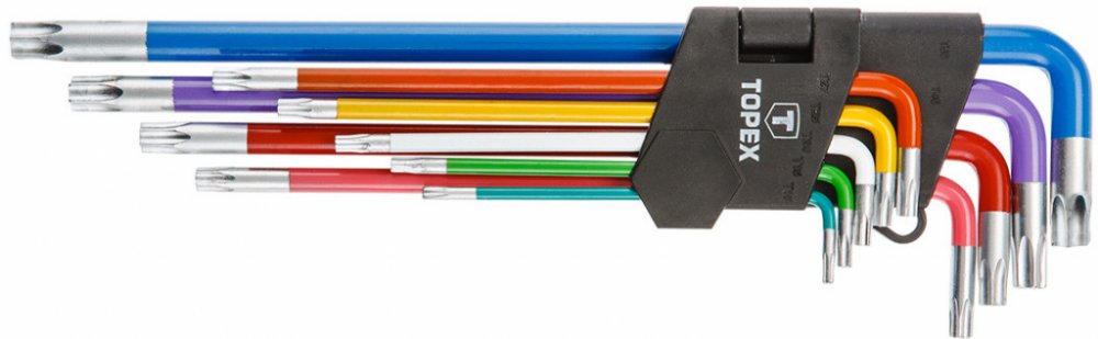Sada klíčů TOPEX Torx (ref. 35D969) obsahuje 9 klíčů velikosti T10 až T50 z odolné chrom-vanadiové oceli. Každá velikost klíče je označena jinou barvou, což usnadňuje rychlý výběr správné velikosti během práce. Vše je zabaleno v praktickém balení. Značka TOPEX je zaměřena na nadšence pro domácí kutily.
