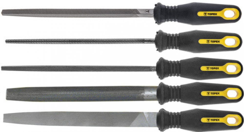 Pilníky na kov TOPEX (ref. 06A250) pro broušení kovů. Pět univerzálních tvarů umožňuje různé aplikace. Vyrobeno z vysoce kvalitní oceli T12. Ergonomická rukojeť pokrytá protiskluzovým materiálem poskytuje pohodlí a bezpečnost při práci. Značka TOPEX je určena pro domácí kutily.
