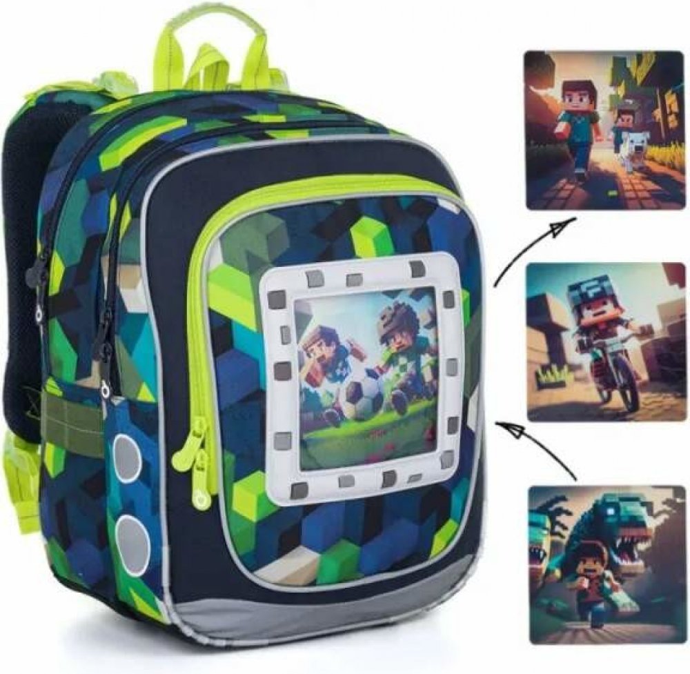 Pro malé milovníky hry Minecraft vytvořila firma Topgal skvělou novinku. Lehoučký batoh v designu této světoznámé hry navíc doplněný o systém výměny 4 obrázků. Zádový systém je lehký díky anatomicky tvarované lisované pěně. Ramenní popruhy jsou polstrované, anatomicky tvarované a hlavně – dají se utáhnout v horní i spodní části batohu.Výškově nastavitelný hrudní pásek zajistí, že popruhy nebudou sjíždět ani z drobných zad. Nejtěžší školní školní potřeby dávejte vždy co nejblíže zádům do zadní komory. Ta je širší než přední komora a pojme vše potřebné do prvních tříd ZŠ. Přední, užší komora, unese vše ostatní a navíc v ní určitě využijete praktickou síťovou kapsu na zip. Jmenovka nad síťovou kapsičkou pomůže batohy rozeznat, i když se ve třídě sejdou dva stejné batohy.K batohu můžete přikoupit i penál ve stejném designu. Ten snadno umístíte do přední komory nebo do přední hluboké kapsy, kde určitě oceníte i odnímatelnou karabinku na klíče.Lahvičku na pití dejte do kapsy na boku batohu, která je skrytá za zipem. Pohodlně se do ní vejde třeba naše lahvička ZIVA. Batoh je bohatě vybaven reflexními prvky, což oceníte hlavně v zimním období