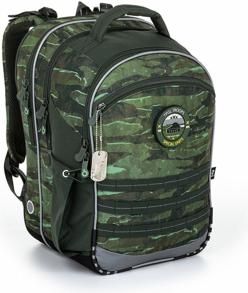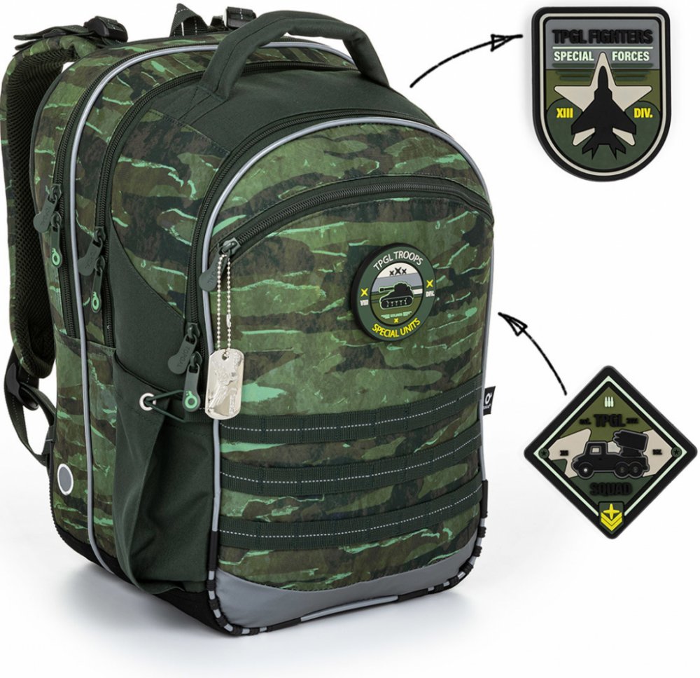 Tříkomorový model COCO je oblíbeným střihem drobných kluků v první třídě, ale i školáků ve vyšších ročnících prvního stupně ZŠ. Dominantou batohu je přívěsek vojenské známky a hravé magnety s vojenskou tématikou. A když o magnetky nebude zájem? Jednoduše se dají oddělat, aniž by narušily celkový design batohu.