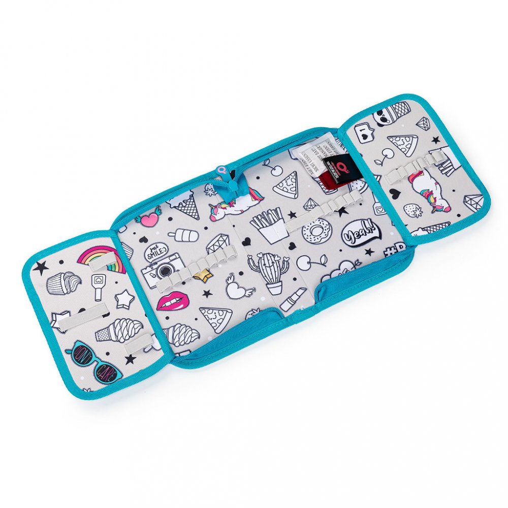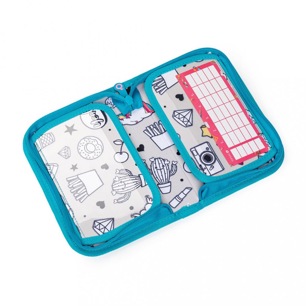 Jednopatrové školní pouzdro se dvěma klopnami je vybaveno 21 klasickými gumovými úchyty na pastelky a fixy, třema širšími úchyty na pravítko, kružítko či nůžky a dvěma většími úchyty na gumu a ořezávátko. Pod klopou z průhledné folie najdete rozvrh hodin, druhé poslouží třeba i na taháky :-)