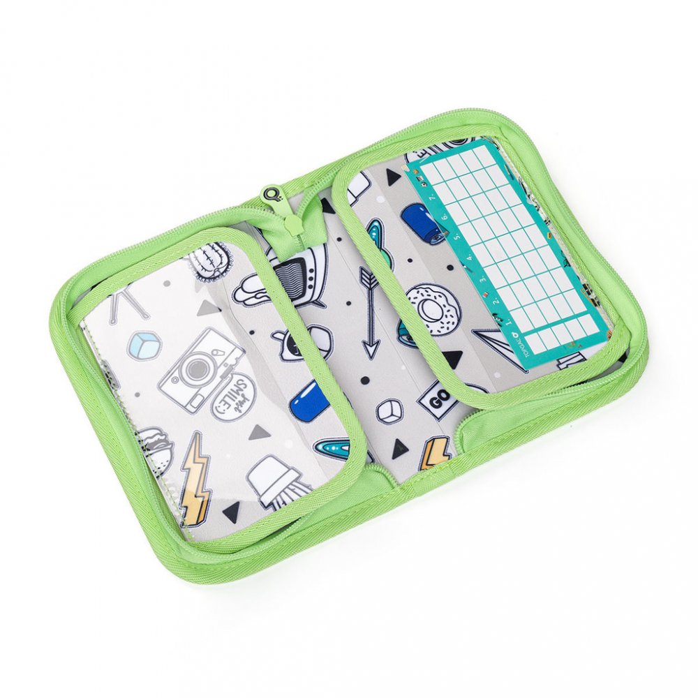 Jednopatrové školní pouzdro se dvěma klopami. Díky gumovým úchytům se do nich vejde celkem dvacetjedna pastelek, tužek a fixek. Tři širší úchyty poslouží na pravítko, kružítko či nůžky. Dva větší na gumu a ořezávátko.