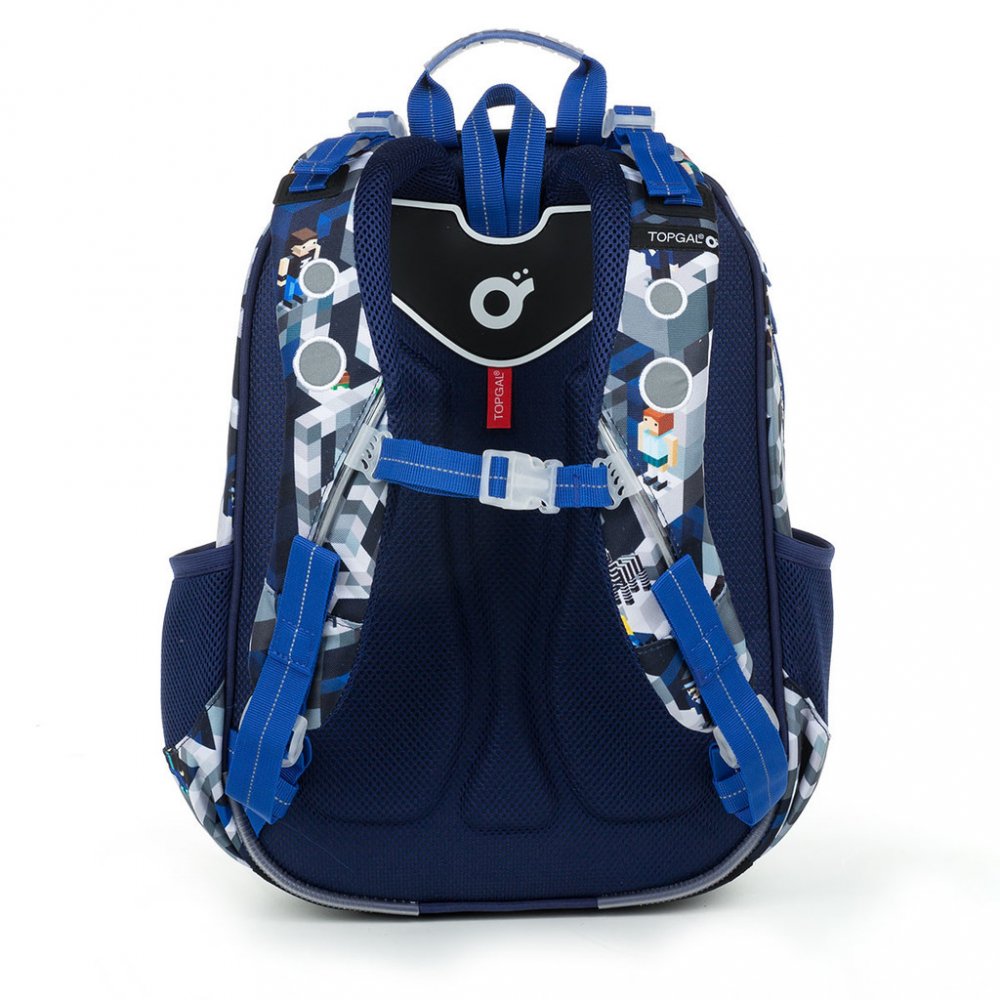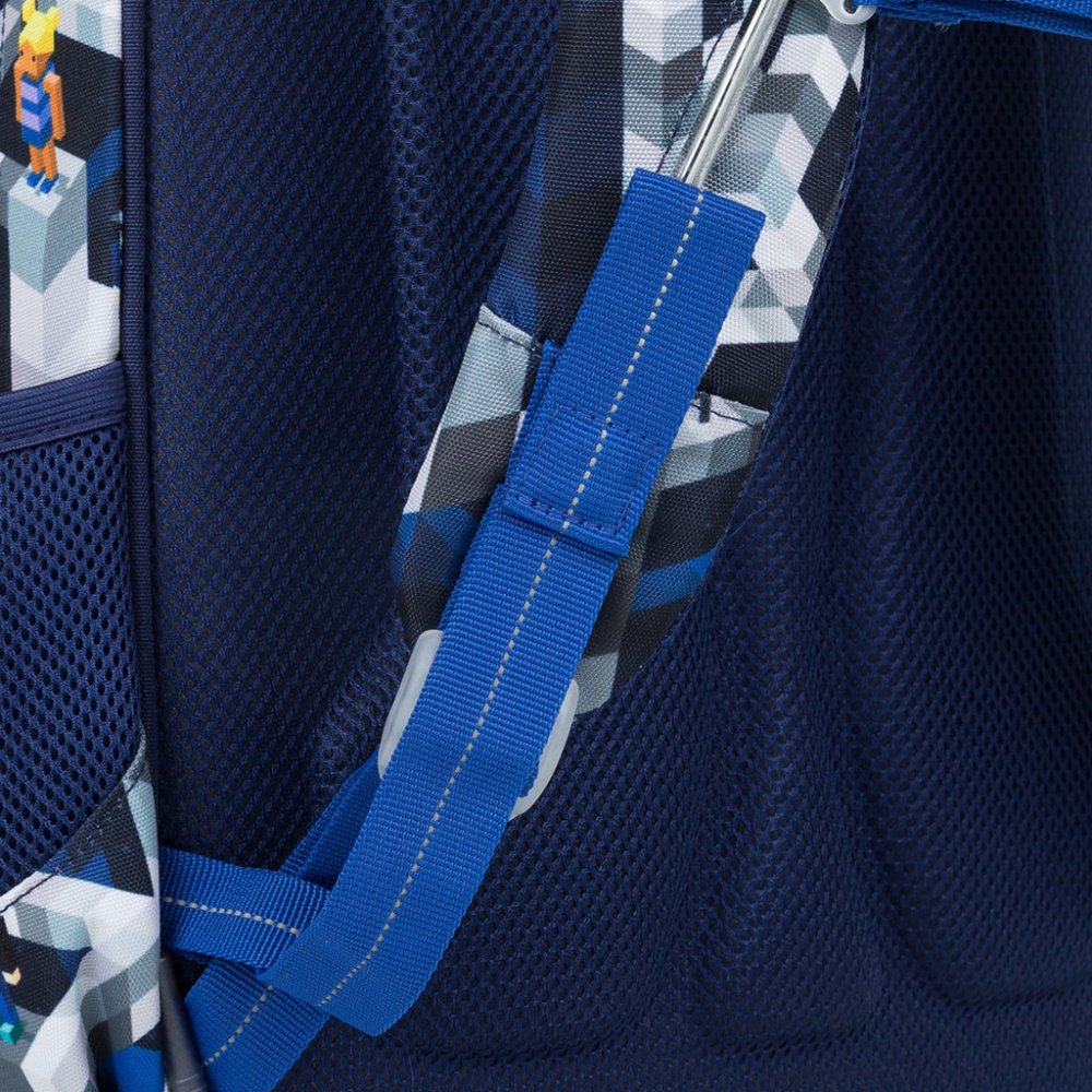Lisovaná zádová část batohu je anatomicky tvarovaná. Spolu s ergonomicky tvarovanými hrudními popruhy, které se dají utáhnout v horní i spodní části, zajistí správné nošení na zádech školáka i při denním nákladu několika kil učení. Navíc jsme do konců popruhů všili magnet, díky kterému je můžete upevnit k tělu popruhu tak, aby volně nevlály. Výškově nastavitelný hrudní pásek pak zaručí, že nebudou ramenní popruhy sjíždět ze zad ani drobnému prvňáčkovi.