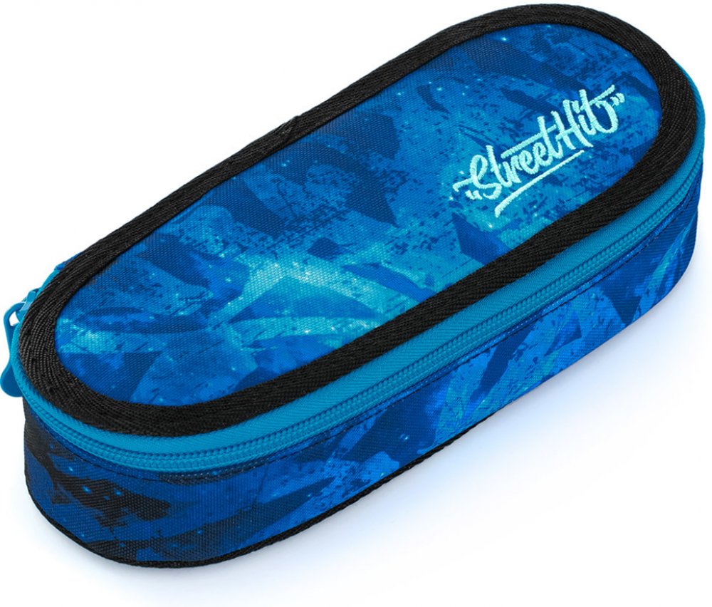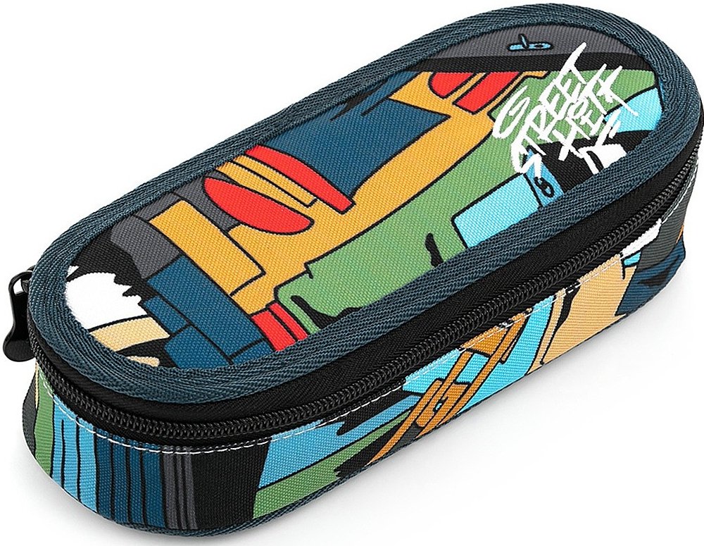Oválný penál pro všechny potřebnosti. Uvnitř pouzdra je síťová kapsička na zip a klopa, na níž jsou umístěny gumičky pro uchycení celkem devíti tužek a propisek, které je potřeba mít přehledně uspořádané a po ruce. Volný prostor pod klopou pak umožňuje volně umístit další psací potřeby – pastelky, fixy, prostě cokoliv potřebujete.