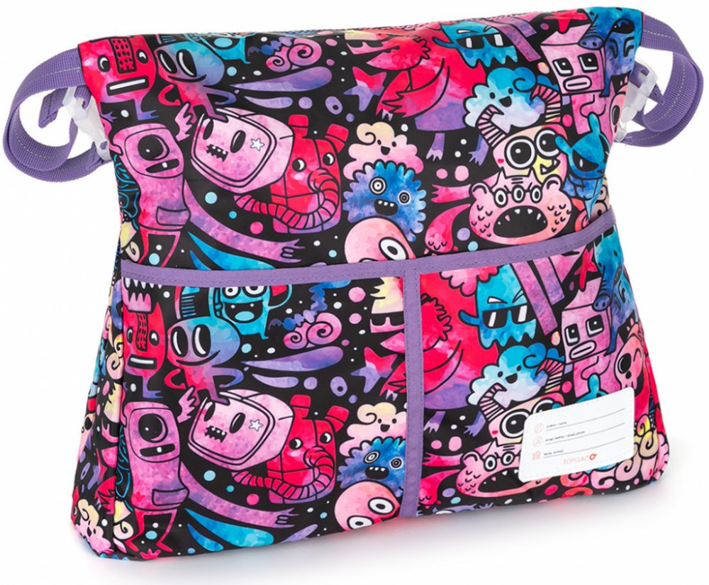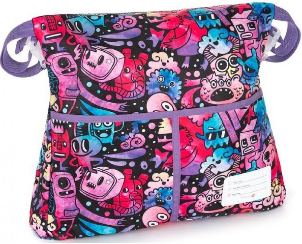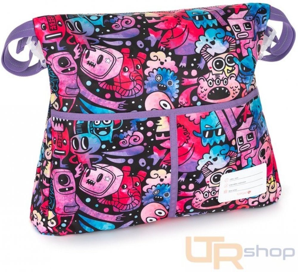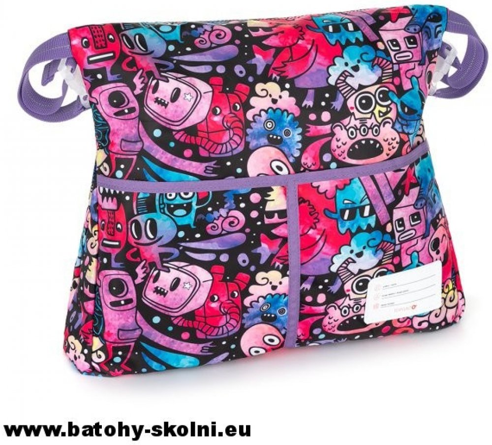 Jedna velká a dvě menší kapsy jsou určeny na uschování drobností každého školáka (vodové barvy a jiné školní pomůcky). Horní velká kapsa je uzavíratelná na zip, dvě boční kapsičky jsou volně přístupné. Pytlík je opatřen jmenovkou a popruhy s přezkami pro uchycení k lavici.