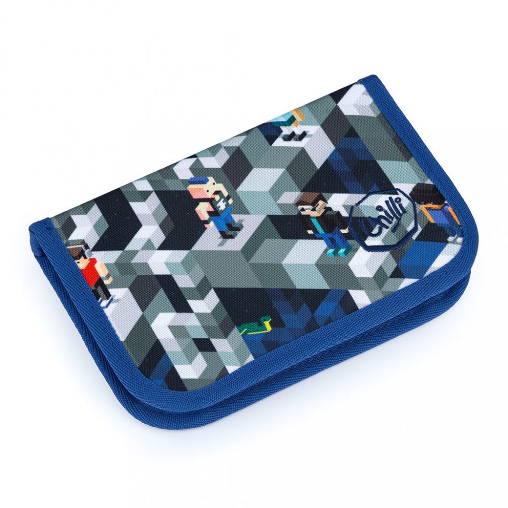 Jednopatrové školní pouzdro s kostičkami je vybaveno osmnácti klasickými gumovými úchyty na pastelky a fixy, čtyřmi širšími úchyty na pravítka, kružítko či nůžky a dvěma většími úchyty na gumu a ořezávátko.