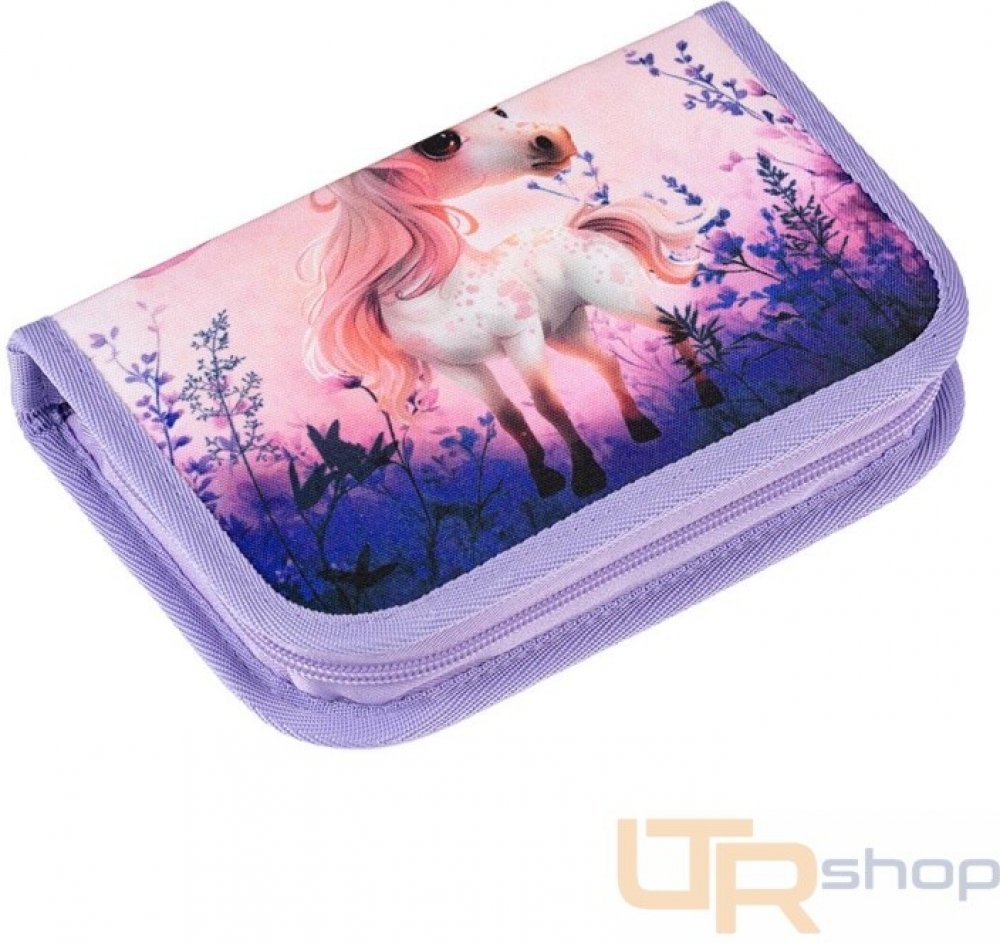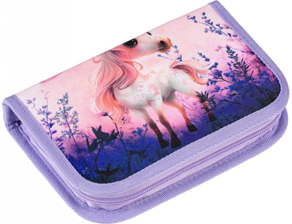 Jednopatrové školní pouzdro se dvěma klopami. Díky gumovým úchytům se do nich vejde celkem dvacetjedna pastelek, tužek a fixek. Tři širší úchyty poslouží na pravítko, kružítko či nůžky. Dva větší na gumu a ořezávátko.