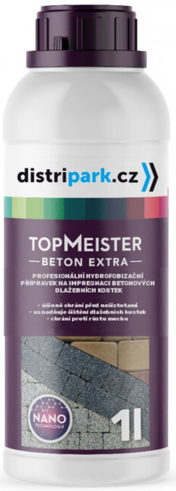 Přípravek TopMeister Beton Extra je profesionální nano přípravek nové generace určený k ochraně a impregnaci betonových dlažebních kostek, obrubníků, dlaždic a plotů z prefabrikovaného betonu. Díky speciálně zvoleným složkám ve zvýšené koncentraci a nanočásticím vytváří impregnant ochranný povlak na povrchu a proniká do materiálu až do hloubky více než 10 milimetrů. Takto zajištěná betonová dlažba je účinně chráněna proti pronikání vody a nečistot, díky níž si zachovává svůj původní vzhled.