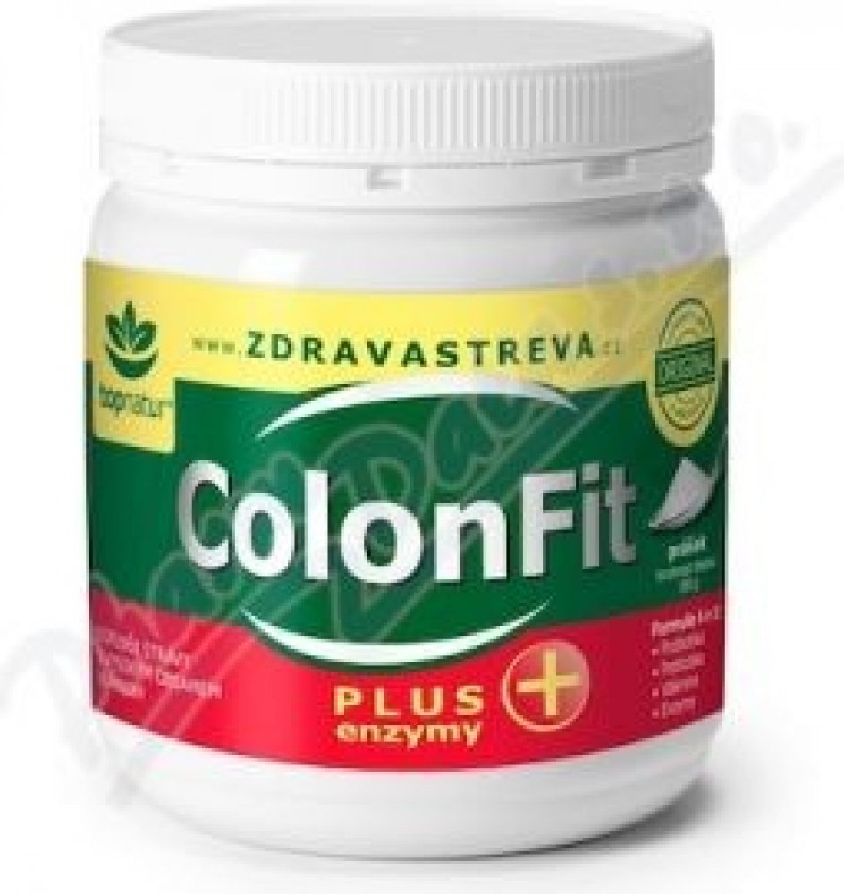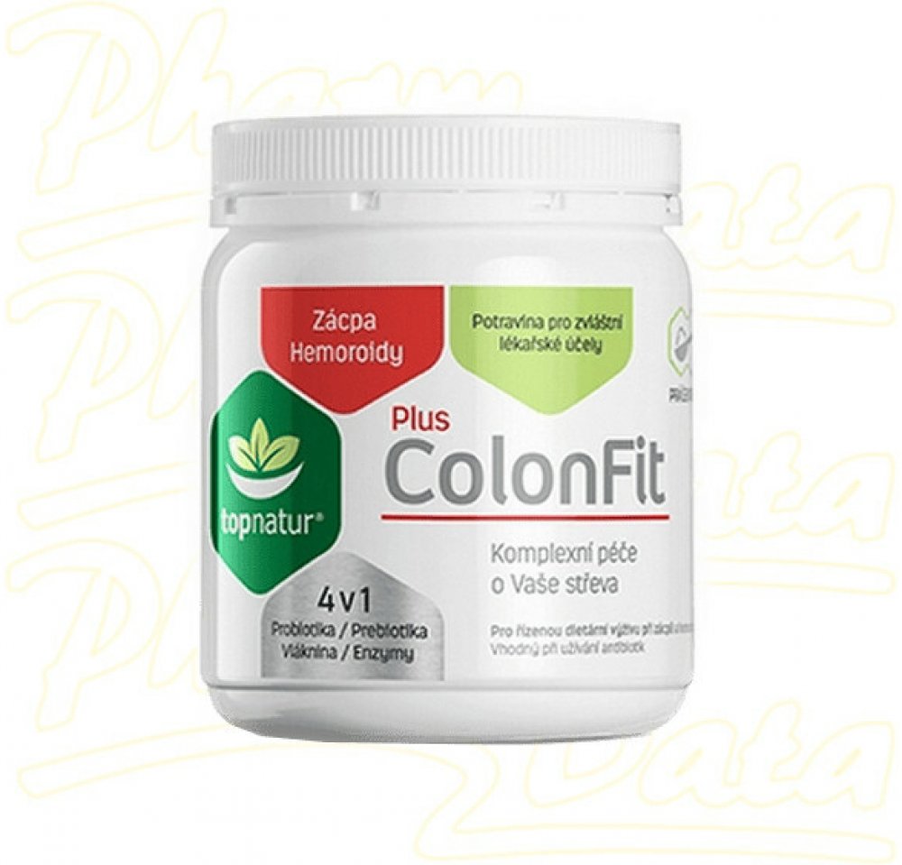 Topnatur ColonFit Plus prášek 180 g. Jedná se o volně prodejnou potravinu pro zvláštní lékařské účely. V roce 2019 byla na Colonfit provedena Studie účinnosti na pacientech z České republiky. 92 % pacientů se zácpou produkt doporučuje! ColonFit je účinný při dlouhodobé zácpě. ColonFit šetrně působí při problémech s hemoroidy. Prostřednictvím ColonFitu rychle doplníte zásobu vlákniny a probiotik. Formule 4 v 1: Probiotika (živé kultury, přátelské bakterie) + Prebiotika (inulín, živiny pro probiotika) + Trávící enzymy + Vláknina psyllium Vláknina Psyllium – rozemleté osemení jitrocele indického, které absorbuje ve vodě více než 40krát svou vlastní hmotnost, je ideálním zdrojem vlákniny a dieteticky pomáhá při poruchách motility střev, které jsou doprovodným příznakem zácpy Probiotika – ColonFit obsahuje 5 unikátních kmenů probiotických kultur Prebiotika – ColonFit obsahuje prebiotika, které slouží jako potrava pro probiotika Trávicí enzymy - proteáza (z ananasu), betain HCl (z řepy), papain (z papayi), bromelain (z ananasu), extrakt z kořene zázvoru, lístky máty peprné, fenyklové semínko. Složení: osemení psyllia (plantago ovata forsk), inulín, trávicí enzymy (proteáza, betain HCL), kořen zázvoru, papain, lístky máty peprné, fenyklové semínko, bromelain, želatinová kapsle, stearát hořečnatý, probiotické kmeny: Lactobacillus rhamnosus, Bifidobacterium bifidum, Lactobacillus acidophius, Lactobacillus plantarum, Lactobacillus bulgaricus.