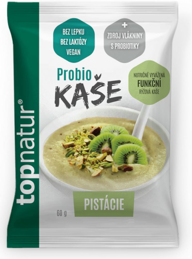 Topnatur Probio kaše pistáciová 60 g. Smetanově jemná rýžová kaše s pistáciemi neobsahuje lepek, laktózu ani kasein, a je tak ideální volbou pro lidi s výživovým omezením i pro všechny, kdo dbají na racionální stravování. Probio kaše jsou jedinečné přídavkem probiotických kmenů. Dále obsahují inulin, prebiotickou vlákninu, která je velmi důležitá jako živný substrát pro růst probiotických kultur o...