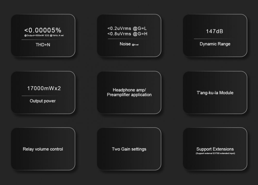 Ultra-výkonný diskrétní sluchátkový zesilovač s výstupem 4-pin XLR, 4.4 mm symetrický a 6.3 mm klasický. S funkcí předzesilovače. Výkon až 6700 mW na kanál (32 ohmů, symetricky). 2 úrovně zisku, THD+N <0.000055 %, 145 dB dynamický rozsah, výstupní impedance <0.1 ohmu.Hrub&yacu...