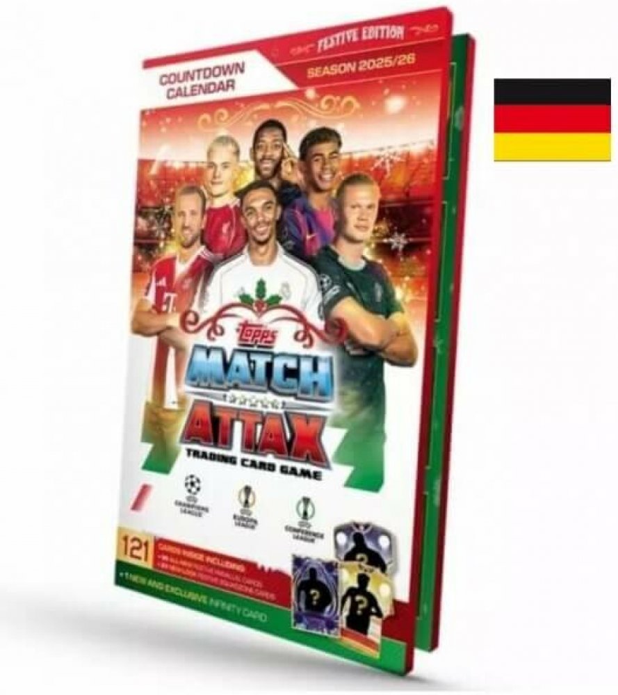 2025-2026 Topps Match Attax Adventní kalendář je balení, které obsahuje 24 dárků pro fotbalového fanouška. Každý den od 1.12. do 24.12. otevřete jeden dáreček a můžete se tak těšit na Vánoce spolu s fotbalovými kartami.
