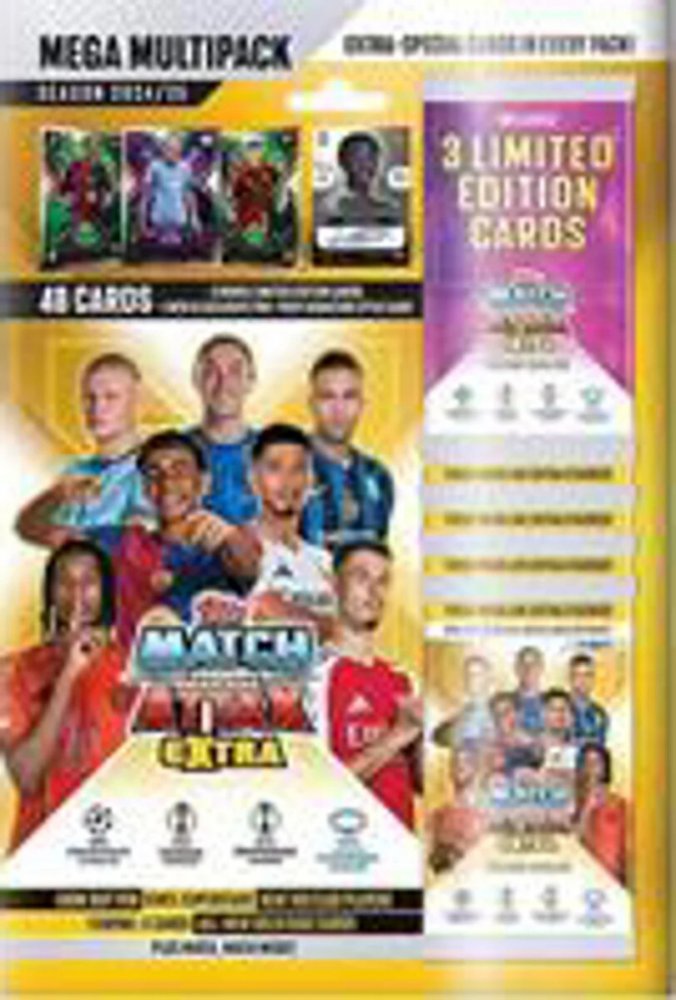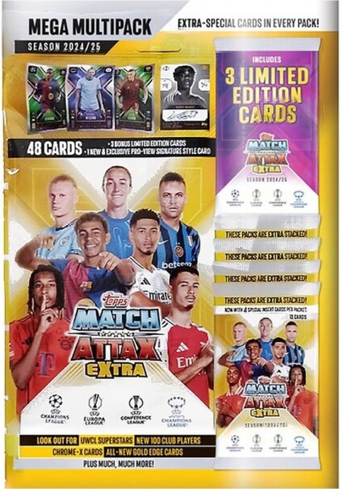 UEFA Club Competitions Match Attax Extra 2024/25 - Mega Multipack. Sběratelské fotbalové karty Topps Match Attax Extra UEFA Club Competitions pro rok 2024/25. Mega Multipack obsahuje 4 x balíček po 12 kartách /48 karet, 3 x náhodná/bonusová limitovaná edice, 1 x bonusová karta exkluzivní edice