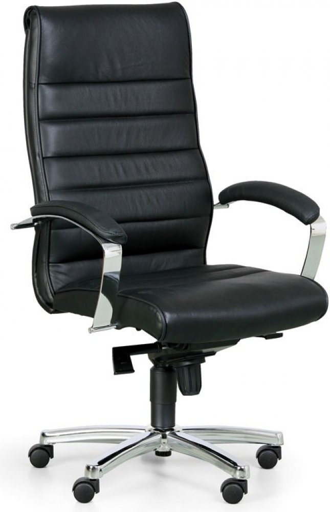 · kancelářské křeslo HORIZONT s potahem z pravé kůže na namáhaných částech, boky a zadní strana potaženy EKO kůží · houpací mechanika s nastavením protiváhy · čalouněné područky pro oporu loktů · sedák se šířkou 56 cm a hloubkou 46 cm, opěrák s výškou 67 cm · ocelový kříž, nosnost 150 kg · kolečka pro měkké podlahy (např. koberce, linoleum atd.)