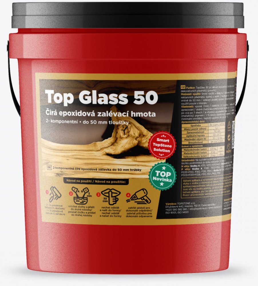 TopGlass 50 je zalévací pryskyřice určená k odlévání dekorativních předmětů (povrchů)