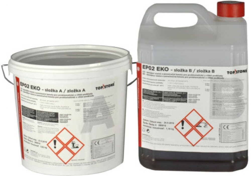 Penetrace EP02 - Epoxidová 2 složková bezrozpoštědlová čirá bezbarvá penetrace s nízkou viskozitou na vlhké a nové betony s výbornou přilnavostí na nesavé podklady; penetrování, zpevňování, injektování, lepení, plastbetony, apod.verze EKO - S plnivem - aplikce s utěsnění pórů v betonu, penetrování prasklin, zpevňování, injektování, (mj=kg)