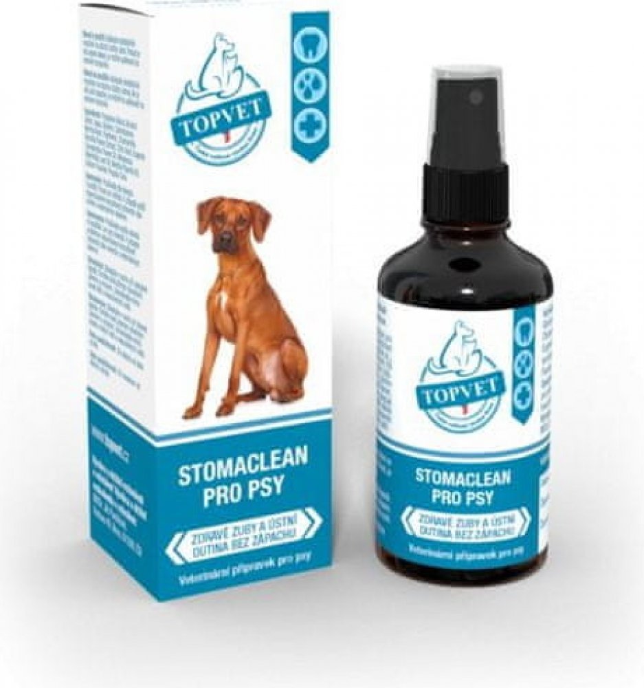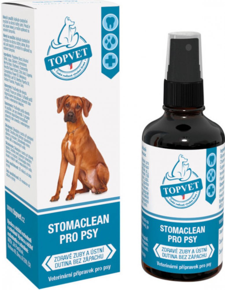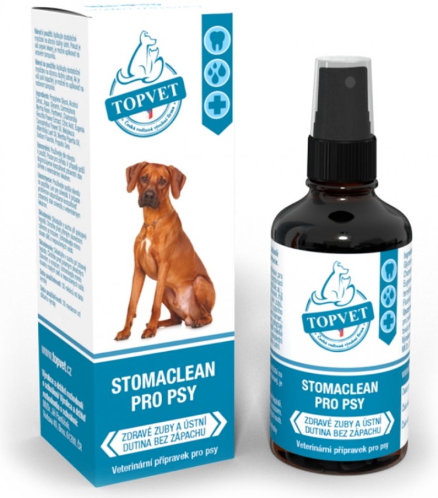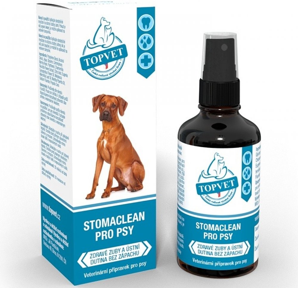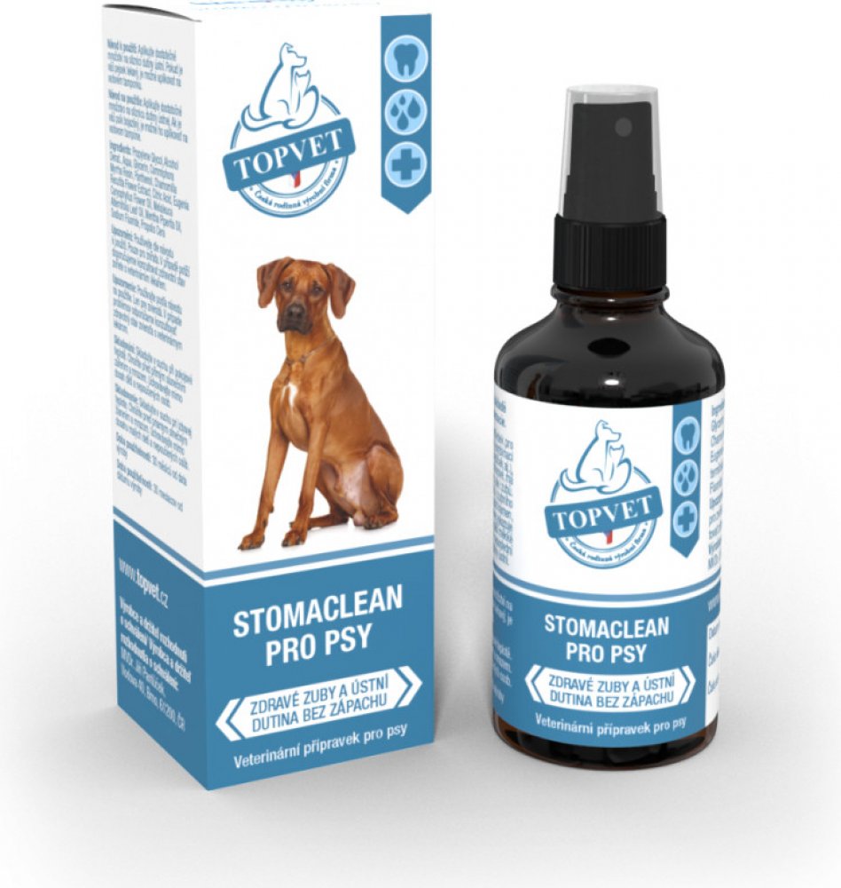 ÚSTNÍ SPREJ STOMACLEAN je prostředek pro péči o ústní dutinu psů. Díky unikátní kombinaci účinných látek (propolis, máta, TTO, hřebíček aj.), samozřejmého taninu, fluoru a kyseliny citronové, má pozitivní vliv nejen na stav dásní a sliznic, ale i zubů. Omezuje tvorbu zubního kamene, plaku i zubního kazu, pomáhá odstranit již vytvořený zubní kámen, prodlužuje efekt odstranění zubního kamene, vykazuje hojivý a regenerační účinek na dásně a další měkké tkáně v dutině ústní, např. při zánětu. V neposlední řadě odstraňuje nepříjemný zápach z dutiny ústní.