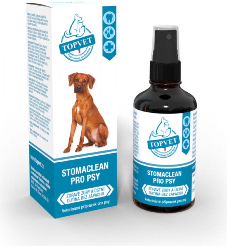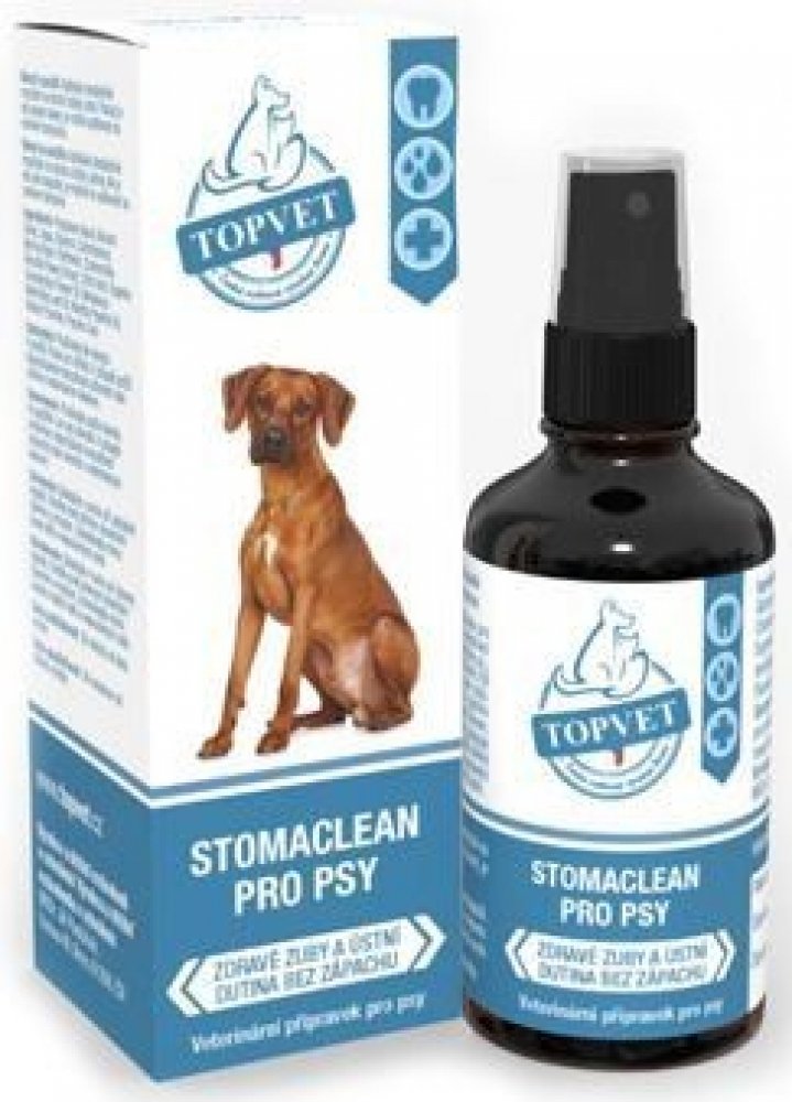 ÚSTNÍ SPREJ STOMACLEAN je prostředek pro péči o ústní dutinu psů. Díky unikátní kombinaci účinných látek (propolis, máta, TTO, hřebíček aj.), samozřejmého taninu, fluoru a kyseliny citronové, má pozitivní vliv nejen na stav dásní a sliznic, ale i zubů. Omezuje tvorbu zubního kamene, plaku i zubního kazu, pomáhá odstranit již vytvořený zubní kámen, prodlužuje efekt odstranění zubního kamene, vykazuje hojivý a regenerační účinek na dásně a další měkké tkáně v dutině ústní, např. při zánětu. V neposlední řadě odstraňuje nepříjemný zápach z dutiny ústní.