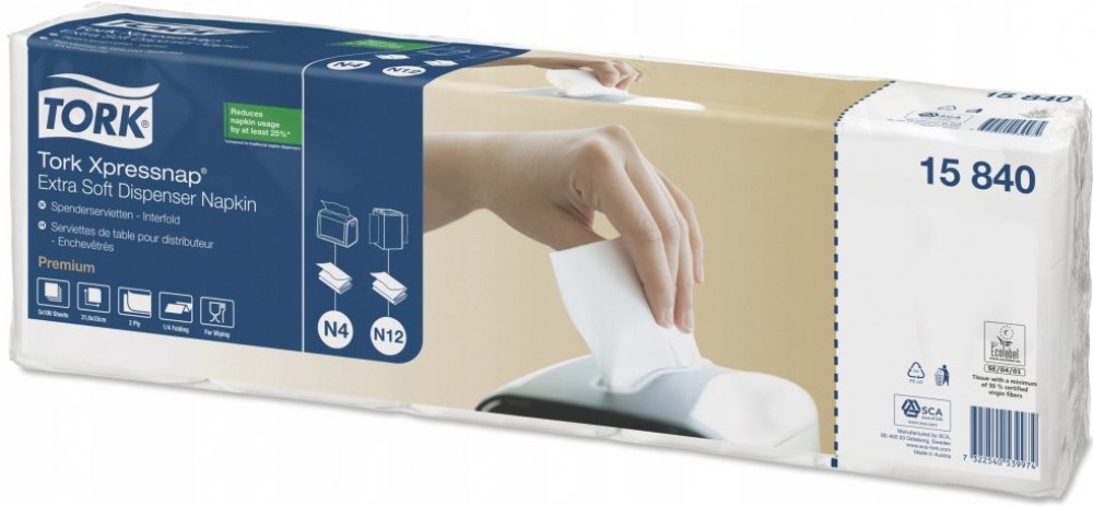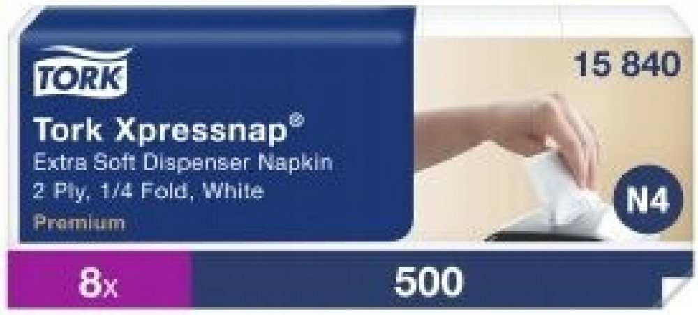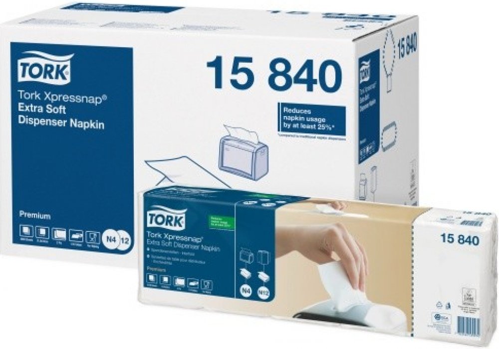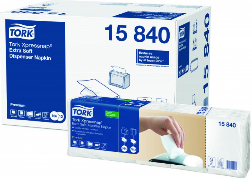 Zásobníky na ubrousky Tork Xpressnap® jsou ideální pro samoobslužné restaurace. Systém vám pomůže snížit spotřebu ubrousků o 25 % v porovnání s tradičními zásobníky na ubrousky. Dvouvrstvé, extra jemné bílé ubrousky do zásobníku Tork Xpressnap® jsou ideální pro podniky, které dbají na komfort a chtějí na zákazníky udělat dojem vysoké kvality tím, že jim nabídnou mimořádně pevný ubrousek., 15840