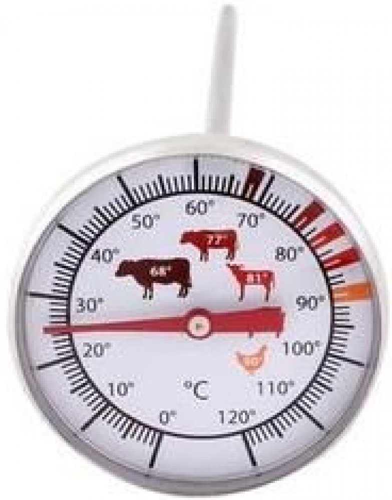 Vpichovací teploměr na pečení, měří vnitřní teplotu masa během pečení v troubě, 0 - 120 °C, umožňuje přesnou kontrolu teploty masa, která je nutná ke zničení všech zdraví škodlivých bakterií. Délka zapichovací jehly 13,6 cm, průměr 4,4 cm. Materiál - plast, nerez. Barva bílá.