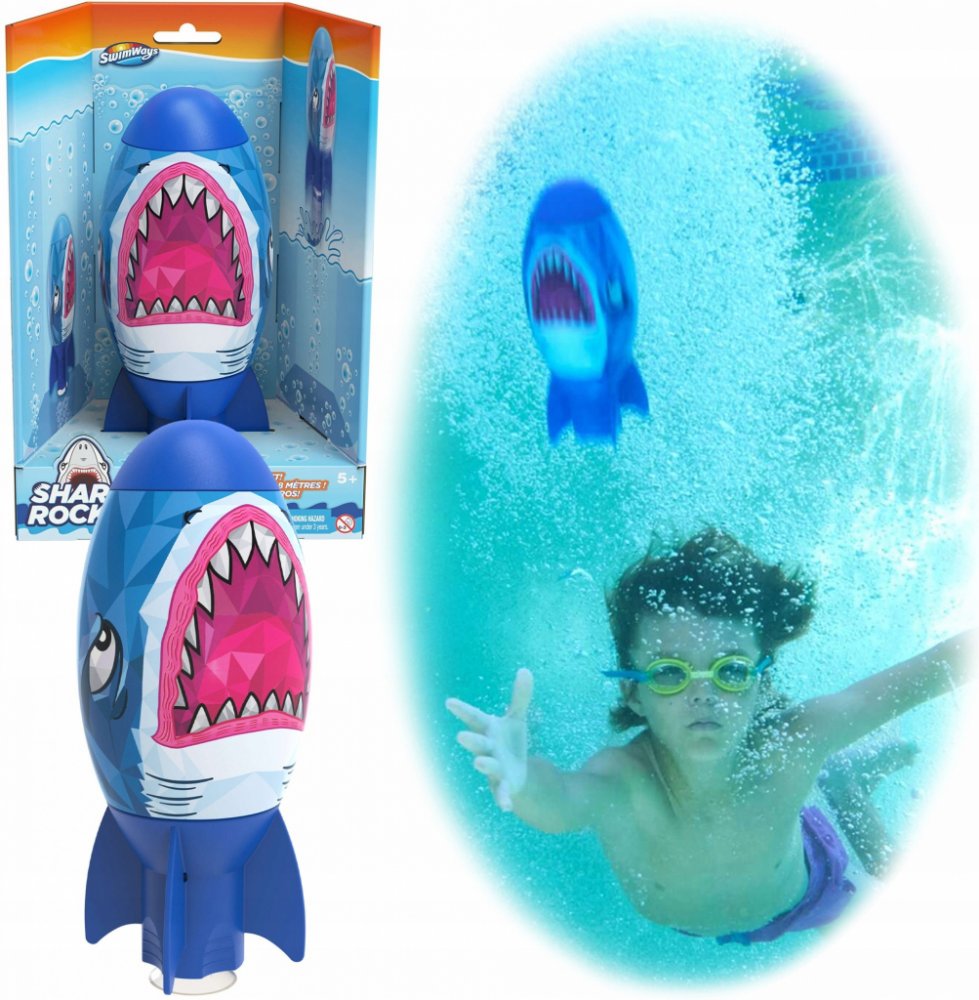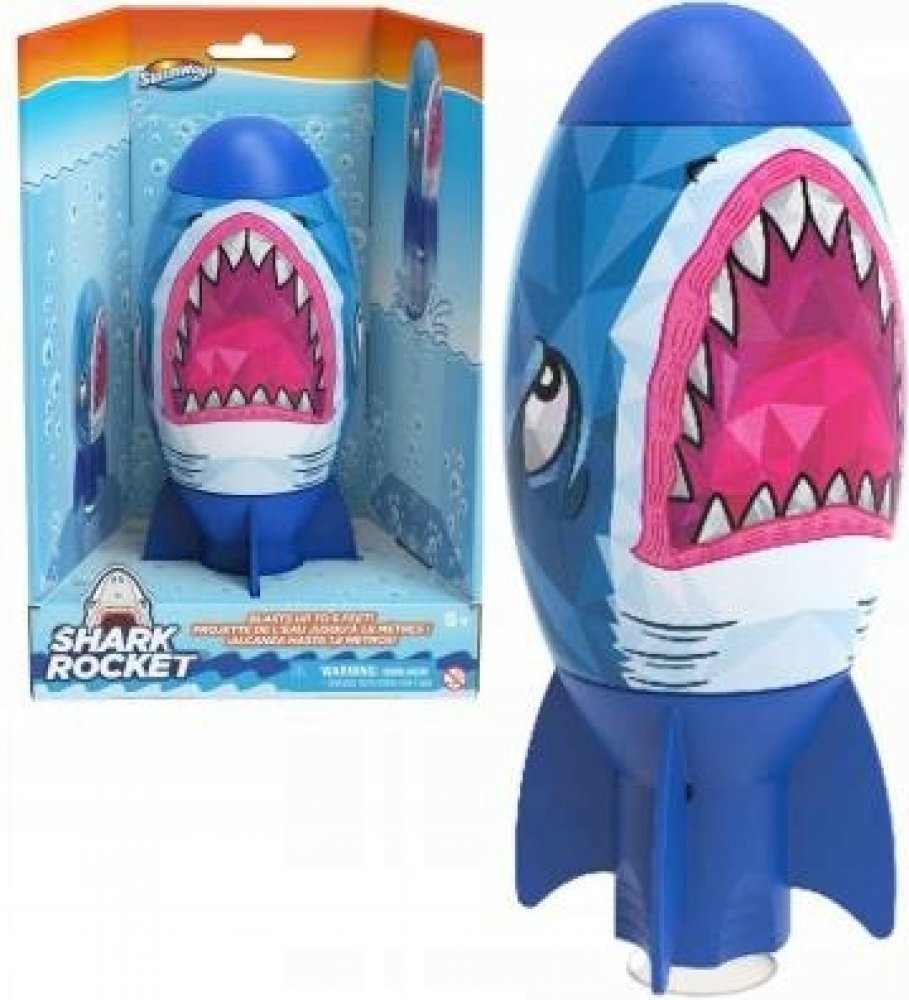 Raketa žralok vystřelí z bazénu až 180 cm nad hladinu. Podrž žraloka pod vodou, namiř a vypusť ji. Nebo ji můžeš ponořit do bazénu, připevni ji ke dnu, počkej 10 sekund a sama vystřelí a vyletí přímo do vzduchu. Je vyrobená z měkké pěny a má lehkou konstrukci. Doporučeno pro děti od 5 let.