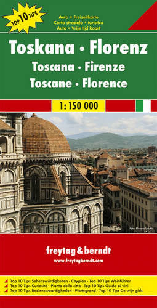 Oboustranná automapa s velmi podrobným mapovým podkladem doplněná plánkem centra Florencie, mapkou Elby a několika dalších přilehlých ostrovů.